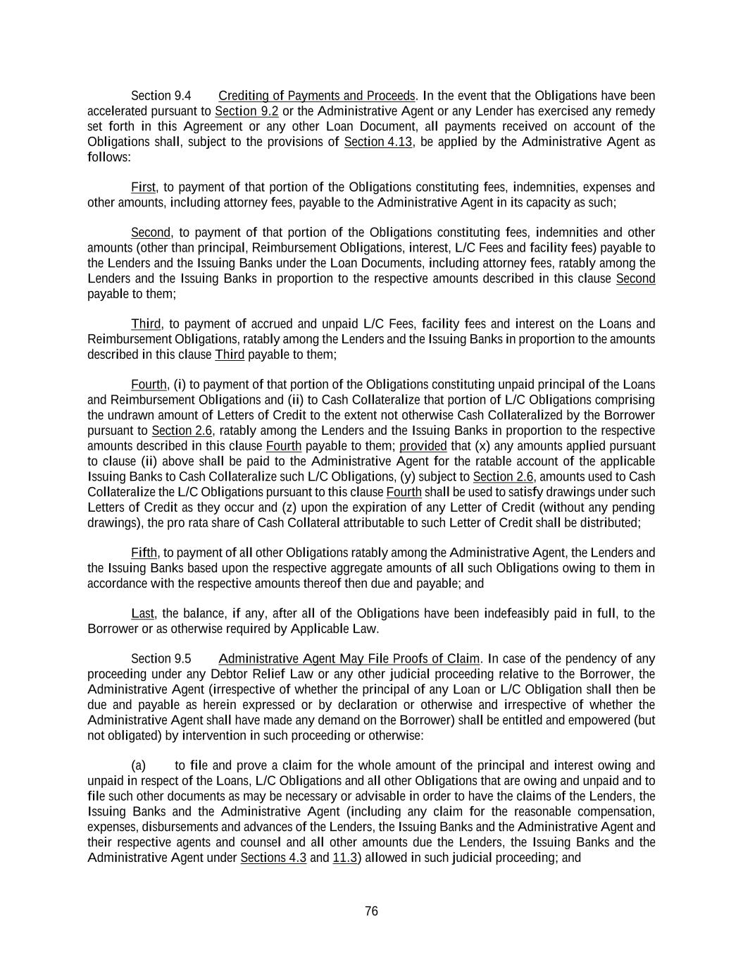 76 Section 9.4 Crediting of Payments and Proceeds. In the event that the Obligations have been accelerated pursuant to Section 9.2 or the Administrative Agent or any Lender has exercised any remedy set forth in this Agreement or any other Loan Document, all payments received on account of the Obligations shall, subject to the provisions of Section 4.13, be applied by the Administrative Agent as follows: First, to payment of that portion of the Obligations constituting fees, indemnities, expenses and other amounts, including attorney fees, payable to the Administrative Agent in its capacity as such; Second, to payment of that portion of the Obligations constituting fees, indemnities and other amounts (other than principal, Reimbursement Obligations, interest, L/C Fees and facility fees) payable to the Lenders and the Issuing Banks under the Loan Documents, including attorney fees, ratably among the Lenders and the Issuing Banks in proportion to the respective amounts described in this clause Second payable to them; Third, to payment of accrued and unpaid L/C Fees, facility fees and interest on the Loans and Reimbursement Obligations, ratably among the Lenders and the Issuing Banks in proportion to the amounts described in this clause Third payable to them; Fourth, (i) to payment of that portion of the Obligations constituting unpaid principal of the Loans and Reimbursement Obligations and (ii) to Cash Collateralize that portion of L/C Obligations comprising the undrawn amount of Letters of Credit to the extent not otherwise Cash Collateralized by the Borrower pursuant to Section 2.6, ratably among the Lenders and the Issuing Banks in proportion to the respective amounts described in this clause Fourth payable to them; provided that (x) any amounts applied pursuant to clause (ii) above shall be paid to the Administrative Agent for the ratable account of the applicable Issuing Banks to Cash Collateralize such L/C Obligations, (y) subject to Section 2.6, amounts used to Cash Collateralize the L/C Obligations pursuant to this clause Fourth shall be used to satisfy drawings under such Letters of Credit as they occur and (z) upon the expiration of any Letter of Credit (without any pending drawings), the pro rata share of Cash Collateral attributable to such Letter of Credit shall be distributed; Fifth, to payment of all other Obligations ratably among the Administrative Agent, the Lenders and the Issuing Banks based upon the respective aggregate amounts of all such Obligations owing to them in accordance with the respective amounts thereof then due and payable; and Last, the balance, if any, after all of the Obligations have been indefeasibly paid in full, to the Borrower or as otherwise required by Applicable Law. Section 9.5 Administrative Agent May File Proofs of Claim. In case of the pendency of any proceeding under any Debtor Relief Law or any other judicial proceeding relative to the Borrower, the Administrative Agent (irrespective of whether the principal of any Loan or L/C Obligation shall then be due and payable as herein expressed or by declaration or otherwise and irrespective of whether the Administrative Agent shall have made any demand on the Borrower) shall be entitled and empowered (but not obligated) by intervention in such proceeding or otherwise: (a) to file and prove a claim for the whole amount of the principal and interest owing and unpaid in respect of the Loans, L/C Obligations and all other Obligations that are owing and unpaid and to file such other documents as may be necessary or advisable in order to have the claims of the Lenders, the Issuing Banks and the Administrative Agent (including any claim for the reasonable compensation, expenses, disbursements and advances of the Lenders, the Issuing Banks and the Administrative Agent and their respective agents and counsel and all other amounts due the Lenders, the Issuing Banks and the Administrative Agent under Sections 4.3 and 11.3) allowed in such judicial proceeding; and