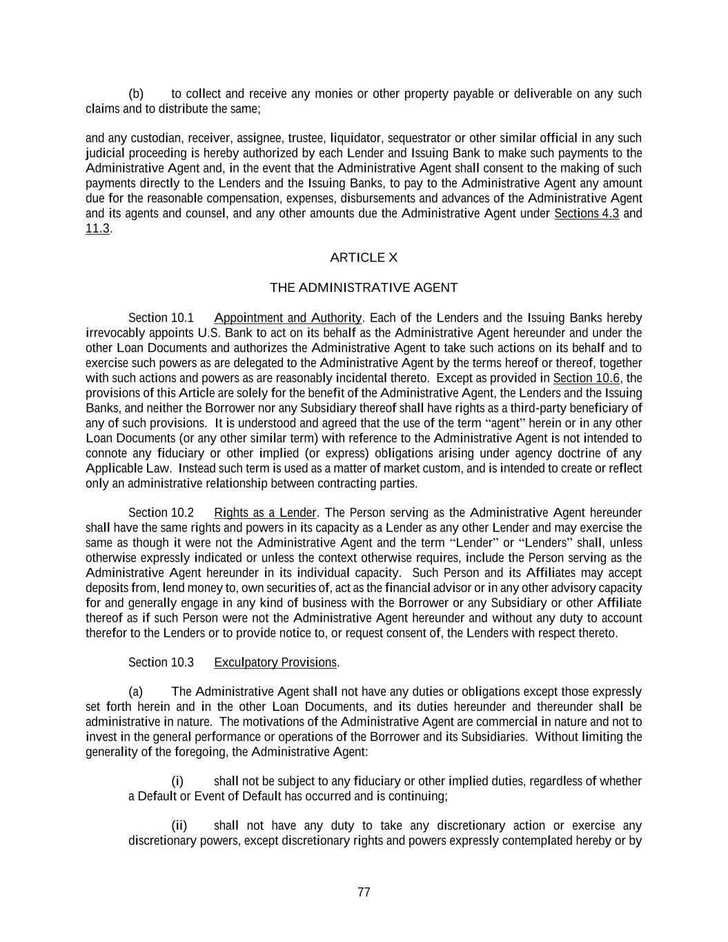 77 (b) to collect and receive any monies or other property payable or deliverable on any such claims and to distribute the same; and any custodian, receiver, assignee, trustee, liquidator, sequestrator or other similar official in any such judicial proceeding is hereby authorized by each Lender and Issuing Bank to make such payments to the Administrative Agent and, in the event that the Administrative Agent shall consent to the making of such payments directly to the Lenders and the Issuing Banks, to pay to the Administrative Agent any amount due for the reasonable compensation, expenses, disbursements and advances of the Administrative Agent and its agents and counsel, and any other amounts due the Administrative Agent under Sections 4.3 and 11.3. ARTICLE X THE ADMINISTRATIVE AGENT Section 10.1 Appointment and Authority. Each of the Lenders and the Issuing Banks hereby irrevocably appoints U.S. Bank to act on its behalf as the Administrative Agent hereunder and under the other Loan Documents and authorizes the Administrative Agent to take such actions on its behalf and to exercise such powers as are delegated to the Administrative Agent by the terms hereof or thereof, together with such actions and powers as are reasonably incidental thereto. Except as provided in Section 10.6, the provisions of this Article are solely for the benefit of the Administrative Agent, the Lenders and the Issuing Banks, and neither the Borrower nor any Subsidiary thereof shall have rights as a third-party beneficiary of any of such provisions. It is understood and agreed that the use of the term “agent” herein or in any other Loan Documents (or any other similar term) with reference to the Administrative Agent is not intended to connote any fiduciary or other implied (or express) obligations arising under agency doctrine of any Applicable Law. Instead such term is used as a matter of market custom, and is intended to create or reflect only an administrative relationship between contracting parties. Section 10.2 Rights as a Lender. The Person serving as the Administrative Agent hereunder shall have the same rights and powers in its capacity as a Lender as any other Lender and may exercise the same as though it were not the Administrative Agent and the term “Lender” or “Lenders” shall, unless otherwise expressly indicated or unless the context otherwise requires, include the Person serving as the Administrative Agent hereunder in its individual capacity. Such Person and its Affiliates may accept deposits from, lend money to, own securities of, act as the financial advisor or in any other advisory capacity for and generally engage in any kind of business with the Borrower or any Subsidiary or other Affiliate thereof as if such Person were not the Administrative Agent hereunder and without any duty to account therefor to the Lenders or to provide notice to, or request consent of, the Lenders with respect thereto. Section 10.3 Exculpatory Provisions. (a) The Administrative Agent shall not have any duties or obligations except those expressly set forth herein and in the other Loan Documents, and its duties hereunder and thereunder shall be administrative in nature. The motivations of the Administrative Agent are commercial in nature and not to invest in the general performance or operations of the Borrower and its Subsidiaries. Without limiting the generality of the foregoing, the Administrative Agent: (i) shall not be subject to any fiduciary or other implied duties, regardless of whether a Default or Event of Default has occurred and is continuing; (ii) shall not have any duty to take any discretionary action or exercise any discretionary powers, except discretionary rights and powers expressly contemplated hereby or by