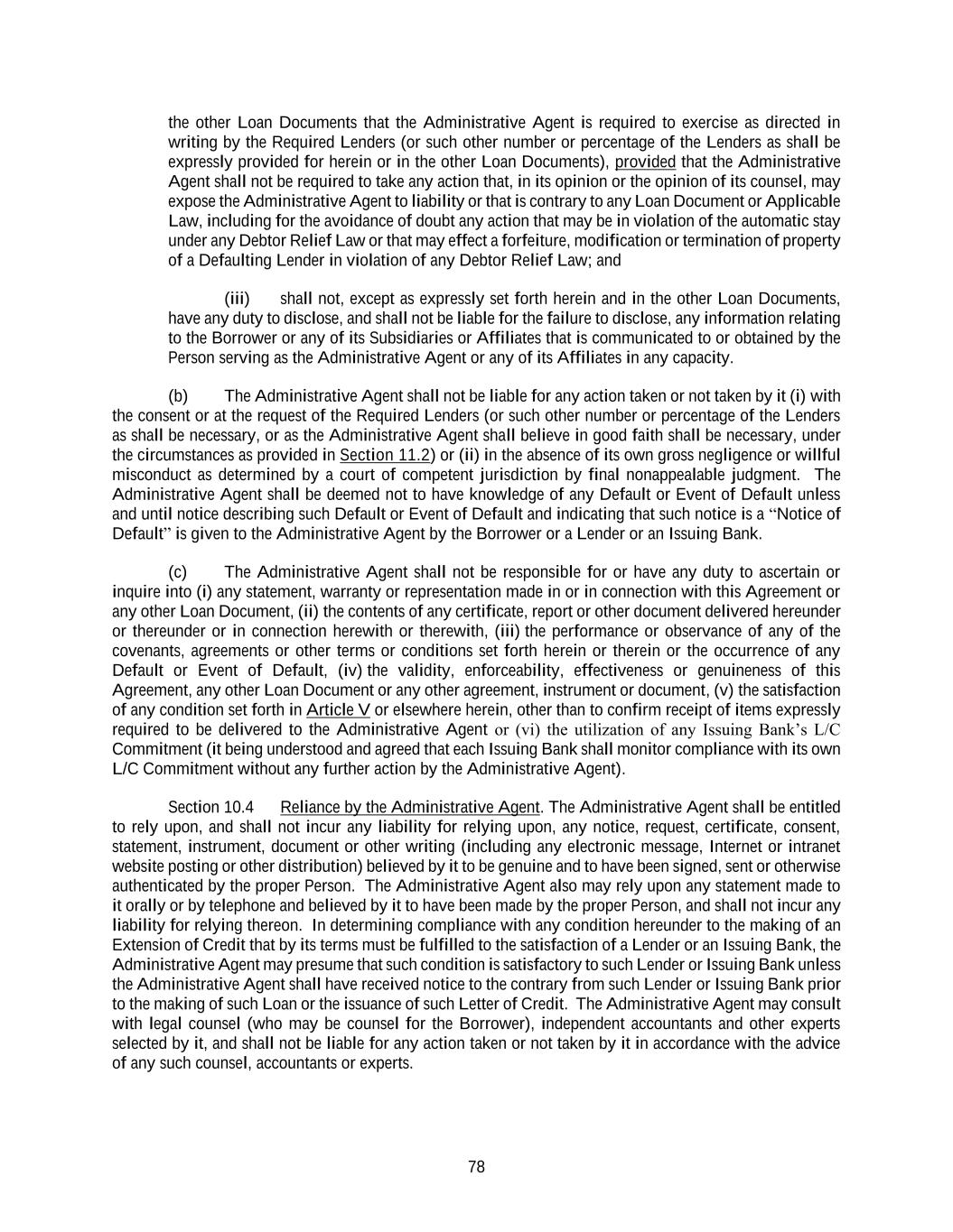 78 the other Loan Documents that the Administrative Agent is required to exercise as directed in writing by the Required Lenders (or such other number or percentage of the Lenders as shall be expressly provided for herein or in the other Loan Documents), provided that the Administrative Agent shall not be required to take any action that, in its opinion or the opinion of its counsel, may expose the Administrative Agent to liability or that is contrary to any Loan Document or Applicable Law, including for the avoidance of doubt any action that may be in violation of the automatic stay under any Debtor Relief Law or that may effect a forfeiture, modification or termination of property of a Defaulting Lender in violation of any Debtor Relief Law; and (iii) shall not, except as expressly set forth herein and in the other Loan Documents, have any duty to disclose, and shall not be liable for the failure to disclose, any information relating to the Borrower or any of its Subsidiaries or Affiliates that is communicated to or obtained by the Person serving as the Administrative Agent or any of its Affiliates in any capacity. (b) The Administrative Agent shall not be liable for any action taken or not taken by it (i) with the consent or at the request of the Required Lenders (or such other number or percentage of the Lenders as shall be necessary, or as the Administrative Agent shall believe in good faith shall be necessary, under the circumstances as provided in Section 11.2) or (ii) in the absence of its own gross negligence or willful misconduct as determined by a court of competent jurisdiction by final nonappealable judgment. The Administrative Agent shall be deemed not to have knowledge of any Default or Event of Default unless and until notice describing such Default or Event of Default and indicating that such notice is a “Notice of Default” is given to the Administrative Agent by the Borrower or a Lender or an Issuing Bank. (c) The Administrative Agent shall not be responsible for or have any duty to ascertain or inquire into (i) any statement, warranty or representation made in or in connection with this Agreement or any other Loan Document, (ii) the contents of any certificate, report or other document delivered hereunder or thereunder or in connection herewith or therewith, (iii) the performance or observance of any of the covenants, agreements or other terms or conditions set forth herein or therein or the occurrence of any Default or Event of Default, (iv) the validity, enforceability, effectiveness or genuineness of this Agreement, any other Loan Document or any other agreement, instrument or document, (v) the satisfaction of any condition set forth in Article V or elsewhere herein, other than to confirm receipt of items expressly required to be delivered to the Administrative Agent or (vi) the utilization of any Issuing Bank’s L/C Commitment (it being understood and agreed that each Issuing Bank shall monitor compliance with its own L/C Commitment without any further action by the Administrative Agent). Section 10.4 Reliance by the Administrative Agent. The Administrative Agent shall be entitled to rely upon, and shall not incur any liability for relying upon, any notice, request, certificate, consent, statement, instrument, document or other writing (including any electronic message, Internet or intranet website posting or other distribution) believed by it to be genuine and to have been signed, sent or otherwise authenticated by the proper Person. The Administrative Agent also may rely upon any statement made to it orally or by telephone and believed by it to have been made by the proper Person, and shall not incur any liability for relying thereon. In determining compliance with any condition hereunder to the making of an Extension of Credit that by its terms must be fulfilled to the satisfaction of a Lender or an Issuing Bank, the Administrative Agent may presume that such condition is satisfactory to such Lender or Issuing Bank unless the Administrative Agent shall have received notice to the contrary from such Lender or Issuing Bank prior to the making of such Loan or the issuance of such Letter of Credit. The Administrative Agent may consult with legal counsel (who may be counsel for the Borrower), independent accountants and other experts selected by it, and shall not be liable for any action taken or not taken by it in accordance with the advice of any such counsel, accountants or experts.