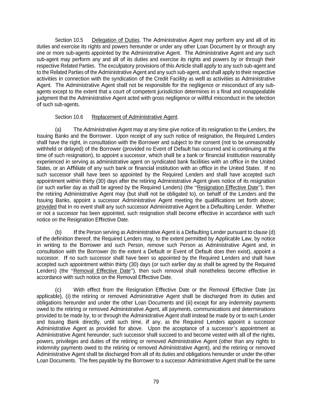 79 Section 10.5 Delegation of Duties. The Administrative Agent may perform any and all of its duties and exercise its rights and powers hereunder or under any other Loan Document by or through any one or more sub-agents appointed by the Administrative Agent. The Administrative Agent and any such sub-agent may perform any and all of its duties and exercise its rights and powers by or through their respective Related Parties. The exculpatory provisions of this Article shall apply to any such sub-agent and to the Related Parties of the Administrative Agent and any such sub-agent, and shall apply to their respective activities in connection with the syndication of the Credit Facility as well as activities as Administrative Agent. The Administrative Agent shall not be responsible for the negligence or misconduct of any sub- agents except to the extent that a court of competent jurisdiction determines in a final and nonappealable judgment that the Administrative Agent acted with gross negligence or willful misconduct in the selection of such sub-agents. Section 10.6 Replacement of Administrative Agent. (a) The Administrative Agent may at any time give notice of its resignation to the Lenders, the Issuing Banks and the Borrower. Upon receipt of any such notice of resignation, the Required Lenders shall have the right, in consultation with the Borrower and subject to the consent (not to be unreasonably withheld or delayed) of the Borrower (provided no Event of Default has occurred and is continuing at the time of such resignation), to appoint a successor, which shall be a bank or financial institution reasonably experienced in serving as administrative agent on syndicated bank facilities with an office in the United States, or an Affiliate of any such bank or financial institution with an office in the United States. If no such successor shall have been so appointed by the Required Lenders and shall have accepted such appointment within thirty (30) days after the retiring Administrative Agent gives notice of its resignation (or such earlier day as shall be agreed by the Required Lenders) (the “Resignation Effective Date”), then the retiring Administrative Agent may (but shall not be obligated to), on behalf of the Lenders and the Issuing Banks, appoint a successor Administrative Agent meeting the qualifications set forth above; provided that in no event shall any such successor Administrative Agent be a Defaulting Lender. Whether or not a successor has been appointed, such resignation shall become effective in accordance with such notice on the Resignation Effective Date. (b) If the Person serving as Administrative Agent is a Defaulting Lender pursuant to clause (d) of the definition thereof, the Required Lenders may, to the extent permitted by Applicable Law, by notice in writing to the Borrower and such Person, remove such Person as Administrative Agent and, in consultation with the Borrower (to the extent a Default or Event of Default does then exist), appoint a successor. If no such successor shall have been so appointed by the Required Lenders and shall have accepted such appointment within thirty (30) days (or such earlier day as shall be agreed by the Required Lenders) (the “Removal Effective Date”), then such removal shall nonetheless become effective in accordance with such notice on the Removal Effective Date. (c) With effect from the Resignation Effective Date or the Removal Effective Date (as applicable), (i) the retiring or removed Administrative Agent shall be discharged from its duties and obligations hereunder and under the other Loan Documents and (ii) except for any indemnity payments owed to the retiring or removed Administrative Agent, all payments, communications and determinations provided to be made by, to or through the Administrative Agent shall instead be made by or to each Lender and Issuing Bank directly, until such time, if any, as the Required Lenders appoint a successor Administrative Agent as provided for above. Upon the acceptance of a successor’s appointment as Administrative Agent hereunder, such successor shall succeed to and become vested with all of the rights, powers, privileges and duties of the retiring or removed Administrative Agent (other than any rights to indemnity payments owed to the retiring or removed Administrative Agent), and the retiring or removed Administrative Agent shall be discharged from all of its duties and obligations hereunder or under the other Loan Documents. The fees payable by the Borrower to a successor Administrative Agent shall be the same