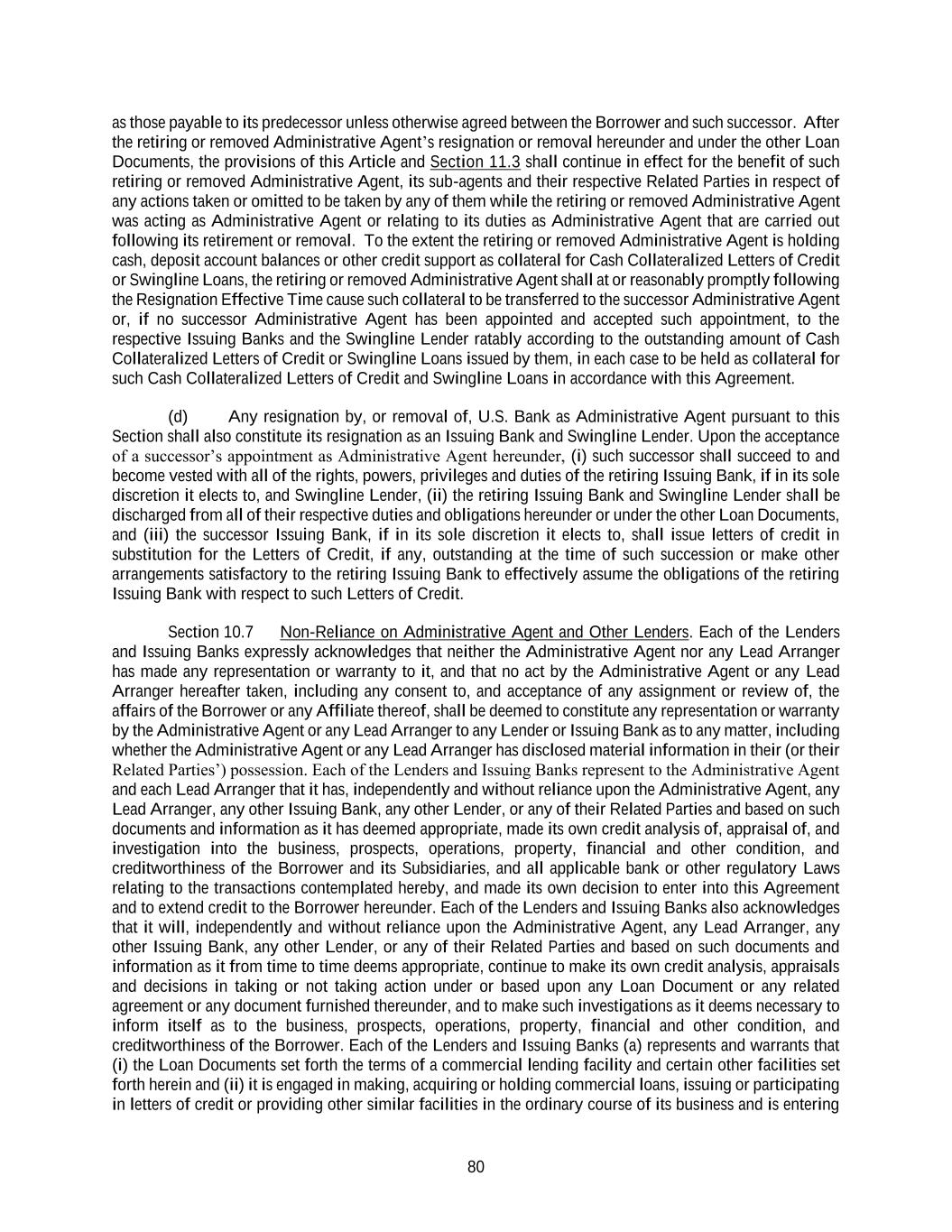 80 as those payable to its predecessor unless otherwise agreed between the Borrower and such successor. After the retiring or removed Administrative Agent’s resignation or removal hereunder and under the other Loan Documents, the provisions of this Article and Section 11.3 shall continue in effect for the benefit of such retiring or removed Administrative Agent, its sub-agents and their respective Related Parties in respect of any actions taken or omitted to be taken by any of them while the retiring or removed Administrative Agent was acting as Administrative Agent or relating to its duties as Administrative Agent that are carried out following its retirement or removal. To the extent the retiring or removed Administrative Agent is holding cash, deposit account balances or other credit support as collateral for Cash Collateralized Letters of Credit or Swingline Loans, the retiring or removed Administrative Agent shall at or reasonably promptly following the Resignation Effective Time cause such collateral to be transferred to the successor Administrative Agent or, if no successor Administrative Agent has been appointed and accepted such appointment, to the respective Issuing Banks and the Swingline Lender ratably according to the outstanding amount of Cash Collateralized Letters of Credit or Swingline Loans issued by them, in each case to be held as collateral for such Cash Collateralized Letters of Credit and Swingline Loans in accordance with this Agreement. (d) Any resignation by, or removal of, U.S. Bank as Administrative Agent pursuant to this Section shall also constitute its resignation as an Issuing Bank and Swingline Lender. Upon the acceptance of a successor’s appointment as Administrative Agent hereunder, (i) such successor shall succeed to and become vested with all of the rights, powers, privileges and duties of the retiring Issuing Bank, if in its sole discretion it elects to, and Swingline Lender, (ii) the retiring Issuing Bank and Swingline Lender shall be discharged from all of their respective duties and obligations hereunder or under the other Loan Documents, and (iii) the successor Issuing Bank, if in its sole discretion it elects to, shall issue letters of credit in substitution for the Letters of Credit, if any, outstanding at the time of such succession or make other arrangements satisfactory to the retiring Issuing Bank to effectively assume the obligations of the retiring Issuing Bank with respect to such Letters of Credit. Section 10.7 Non-Reliance on Administrative Agent and Other Lenders. Each of the Lenders and Issuing Banks expressly acknowledges that neither the Administrative Agent nor any Lead Arranger has made any representation or warranty to it, and that no act by the Administrative Agent or any Lead Arranger hereafter taken, including any consent to, and acceptance of any assignment or review of, the affairs of the Borrower or any Affiliate thereof, shall be deemed to constitute any representation or warranty by the Administrative Agent or any Lead Arranger to any Lender or Issuing Bank as to any matter, including whether the Administrative Agent or any Lead Arranger has disclosed material information in their (or their Related Parties’) possession. Each of the Lenders and Issuing Banks represent to the Administrative Agent and each Lead Arranger that it has, independently and without reliance upon the Administrative Agent, any Lead Arranger, any other Issuing Bank, any other Lender, or any of their Related Parties and based on such documents and information as it has deemed appropriate, made its own credit analysis of, appraisal of, and investigation into the business, prospects, operations, property, financial and other condition, and creditworthiness of the Borrower and its Subsidiaries, and all applicable bank or other regulatory Laws relating to the transactions contemplated hereby, and made its own decision to enter into this Agreement and to extend credit to the Borrower hereunder. Each of the Lenders and Issuing Banks also acknowledges that it will, independently and without reliance upon the Administrative Agent, any Lead Arranger, any other Issuing Bank, any other Lender, or any of their Related Parties and based on such documents and information as it from time to time deems appropriate, continue to make its own credit analysis, appraisals and decisions in taking or not taking action under or based upon any Loan Document or any related agreement or any document furnished thereunder, and to make such investigations as it deems necessary to inform itself as to the business, prospects, operations, property, financial and other condition, and creditworthiness of the Borrower. Each of the Lenders and Issuing Banks (a) represents and warrants that (i) the Loan Documents set forth the terms of a commercial lending facility and certain other facilities set forth herein and (ii) it is engaged in making, acquiring or holding commercial loans, issuing or participating in letters of credit or providing other similar facilities in the ordinary course of its business and is entering