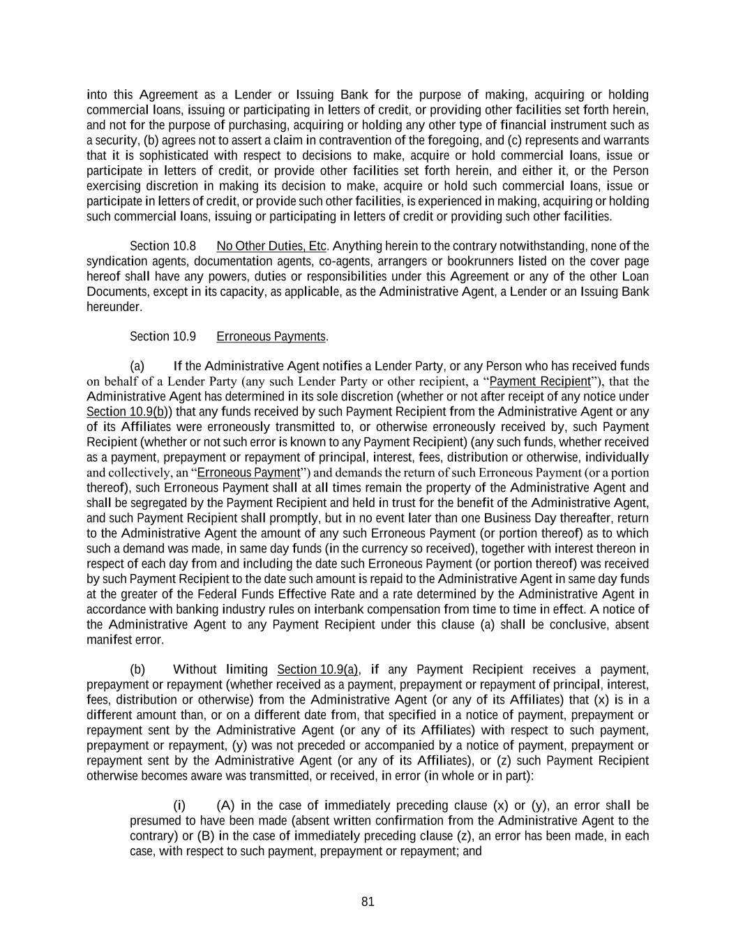 81 into this Agreement as a Lender or Issuing Bank for the purpose of making, acquiring or holding commercial loans, issuing or participating in letters of credit, or providing other facilities set forth herein, and not for the purpose of purchasing, acquiring or holding any other type of financial instrument such as a security, (b) agrees not to assert a claim in contravention of the foregoing, and (c) represents and warrants that it is sophisticated with respect to decisions to make, acquire or hold commercial loans, issue or participate in letters of credit, or provide other facilities set forth herein, and either it, or the Person exercising discretion in making its decision to make, acquire or hold such commercial loans, issue or participate in letters of credit, or provide such other facilities, is experienced in making, acquiring or holding such commercial loans, issuing or participating in letters of credit or providing such other facilities. Section 10.8 No Other Duties, Etc. Anything herein to the contrary notwithstanding, none of the syndication agents, documentation agents, co-agents, arrangers or bookrunners listed on the cover page hereof shall have any powers, duties or responsibilities under this Agreement or any of the other Loan Documents, except in its capacity, as applicable, as the Administrative Agent, a Lender or an Issuing Bank hereunder. Section 10.9 Erroneous Payments. (a) If the Administrative Agent notifies a Lender Party, or any Person who has received funds on behalf of a Lender Party (any such Lender Party or other recipient, a “Payment Recipient”), that the Administrative Agent has determined in its sole discretion (whether or not after receipt of any notice under Section 10.9(b)) that any funds received by such Payment Recipient from the Administrative Agent or any of its Affiliates were erroneously transmitted to, or otherwise erroneously received by, such Payment Recipient (whether or not such error is known to any Payment Recipient) (any such funds, whether received as a payment, prepayment or repayment of principal, interest, fees, distribution or otherwise, individually and collectively, an “Erroneous Payment”) and demands the return of such Erroneous Payment (or a portion thereof), such Erroneous Payment shall at all times remain the property of the Administrative Agent and shall be segregated by the Payment Recipient and held in trust for the benefit of the Administrative Agent, and such Payment Recipient shall promptly, but in no event later than one Business Day thereafter, return to the Administrative Agent the amount of any such Erroneous Payment (or portion thereof) as to which such a demand was made, in same day funds (in the currency so received), together with interest thereon in respect of each day from and including the date such Erroneous Payment (or portion thereof) was received by such Payment Recipient to the date such amount is repaid to the Administrative Agent in same day funds at the greater of the Federal Funds Effective Rate and a rate determined by the Administrative Agent in accordance with banking industry rules on interbank compensation from time to time in effect. A notice of the Administrative Agent to any Payment Recipient under this clause (a) shall be conclusive, absent manifest error. (b) Without limiting Section 10.9(a), if any Payment Recipient receives a payment, prepayment or repayment (whether received as a payment, prepayment or repayment of principal, interest, fees, distribution or otherwise) from the Administrative Agent (or any of its Affiliates) that (x) is in a different amount than, or on a different date from, that specified in a notice of payment, prepayment or repayment sent by the Administrative Agent (or any of its Affiliates) with respect to such payment, prepayment or repayment, (y) was not preceded or accompanied by a notice of payment, prepayment or repayment sent by the Administrative Agent (or any of its Affiliates), or (z) such Payment Recipient otherwise becomes aware was transmitted, or received, in error (in whole or in part): (i) (A) in the case of immediately preceding clause (x) or (y), an error shall be presumed to have been made (absent written confirmation from the Administrative Agent to the contrary) or (B) in the case of immediately preceding clause (z), an error has been made, in each case, with respect to such payment, prepayment or repayment; and