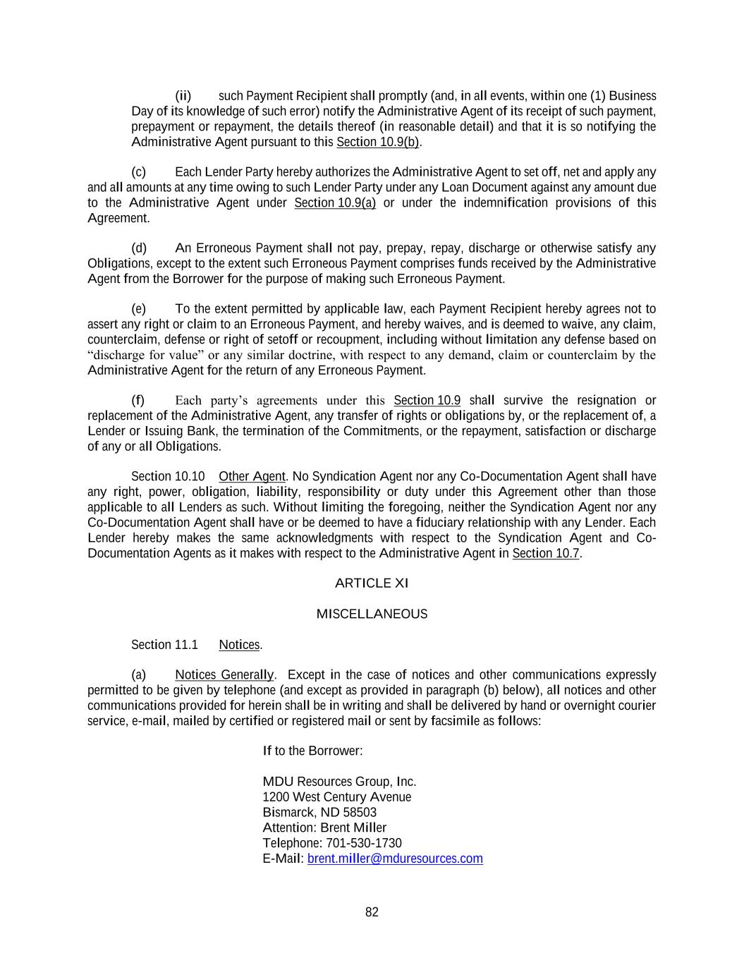 82 (ii) such Payment Recipient shall promptly (and, in all events, within one (1) Business Day of its knowledge of such error) notify the Administrative Agent of its receipt of such payment, prepayment or repayment, the details thereof (in reasonable detail) and that it is so notifying the Administrative Agent pursuant to this Section 10.9(b). (c) Each Lender Party hereby authorizes the Administrative Agent to set off, net and apply any and all amounts at any time owing to such Lender Party under any Loan Document against any amount due to the Administrative Agent under Section 10.9(a) or under the indemnification provisions of this Agreement. (d) An Erroneous Payment shall not pay, prepay, repay, discharge or otherwise satisfy any Obligations, except to the extent such Erroneous Payment comprises funds received by the Administrative Agent from the Borrower for the purpose of making such Erroneous Payment. (e) To the extent permitted by applicable law, each Payment Recipient hereby agrees not to assert any right or claim to an Erroneous Payment, and hereby waives, and is deemed to waive, any claim, counterclaim, defense or right of setoff or recoupment, including without limitation any defense based on “discharge for value” or any similar doctrine, with respect to any demand, claim or counterclaim by the Administrative Agent for the return of any Erroneous Payment. (f) Each party’s agreements under this Section 10.9 shall survive the resignation or replacement of the Administrative Agent, any transfer of rights or obligations by, or the replacement of, a Lender or Issuing Bank, the termination of the Commitments, or the repayment, satisfaction or discharge of any or all Obligations. Section 10.10 Other Agent. No Syndication Agent nor any Co-Documentation Agent shall have any right, power, obligation, liability, responsibility or duty under this Agreement other than those applicable to all Lenders as such. Without limiting the foregoing, neither the Syndication Agent nor any Co-Documentation Agent shall have or be deemed to have a fiduciary relationship with any Lender. Each Lender hereby makes the same acknowledgments with respect to the Syndication Agent and Co- Documentation Agents as it makes with respect to the Administrative Agent in Section 10.7. ARTICLE XI MISCELLANEOUS Section 11.1 Notices. (a) Notices Generally. Except in the case of notices and other communications expressly permitted to be given by telephone (and except as provided in paragraph (b) below), all notices and other communications provided for herein shall be in writing and shall be delivered by hand or overnight courier service, e-mail, mailed by certified or registered mail or sent by facsimile as follows: If to the Borrower: MDU Resources Group, Inc. 1200 West Century Avenue Bismarck, ND 58503 Attention: Brent Miller Telephone: 701-530-1730 E-Mail: brent.miller@mduresources.com