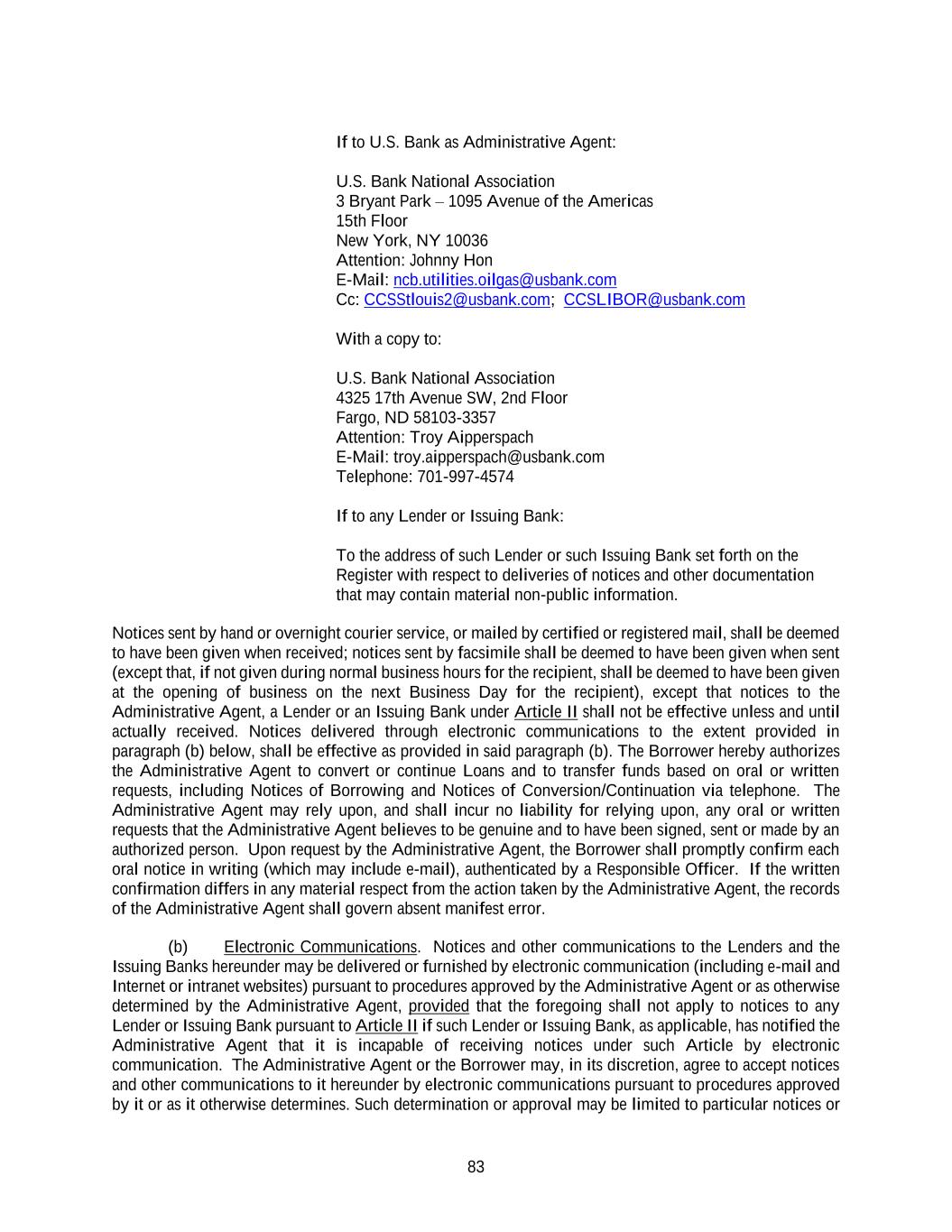 83 If to U.S. Bank as Administrative Agent: U.S. Bank National Association 3 Bryant Park – 1095 Avenue of the Americas 15th Floor New York, NY 10036 Attention: Johnny Hon E-Mail: ncb.utilities.oilgas@usbank.com Cc: CCSStlouis2@usbank.com; CCSLIBOR@usbank.com With a copy to: U.S. Bank National Association 4325 17th Avenue SW, 2nd Floor Fargo, ND 58103-3357 Attention: Troy Aipperspach E-Mail: troy.aipperspach@usbank.com Telephone: 701-997-4574 If to any Lender or Issuing Bank: To the address of such Lender or such Issuing Bank set forth on the Register with respect to deliveries of notices and other documentation that may contain material non-public information. Notices sent by hand or overnight courier service, or mailed by certified or registered mail, shall be deemed to have been given when received; notices sent by facsimile shall be deemed to have been given when sent (except that, if not given during normal business hours for the recipient, shall be deemed to have been given at the opening of business on the next Business Day for the recipient), except that notices to the Administrative Agent, a Lender or an Issuing Bank under Article II shall not be effective unless and until actually received. Notices delivered through electronic communications to the extent provided in paragraph (b) below, shall be effective as provided in said paragraph (b). The Borrower hereby authorizes the Administrative Agent to convert or continue Loans and to transfer funds based on oral or written requests, including Notices of Borrowing and Notices of Conversion/Continuation via telephone. The Administrative Agent may rely upon, and shall incur no liability for relying upon, any oral or written requests that the Administrative Agent believes to be genuine and to have been signed, sent or made by an authorized person. Upon request by the Administrative Agent, the Borrower shall promptly confirm each oral notice in writing (which may include e-mail), authenticated by a Responsible Officer. If the written confirmation differs in any material respect from the action taken by the Administrative Agent, the records of the Administrative Agent shall govern absent manifest error. (b) Electronic Communications. Notices and other communications to the Lenders and the Issuing Banks hereunder may be delivered or furnished by electronic communication (including e-mail and Internet or intranet websites) pursuant to procedures approved by the Administrative Agent or as otherwise determined by the Administrative Agent, provided that the foregoing shall not apply to notices to any Lender or Issuing Bank pursuant to Article II if such Lender or Issuing Bank, as applicable, has notified the Administrative Agent that it is incapable of receiving notices under such Article by electronic communication. The Administrative Agent or the Borrower may, in its discretion, agree to accept notices and other communications to it hereunder by electronic communications pursuant to procedures approved by it or as it otherwise determines. Such determination or approval may be limited to particular notices or
