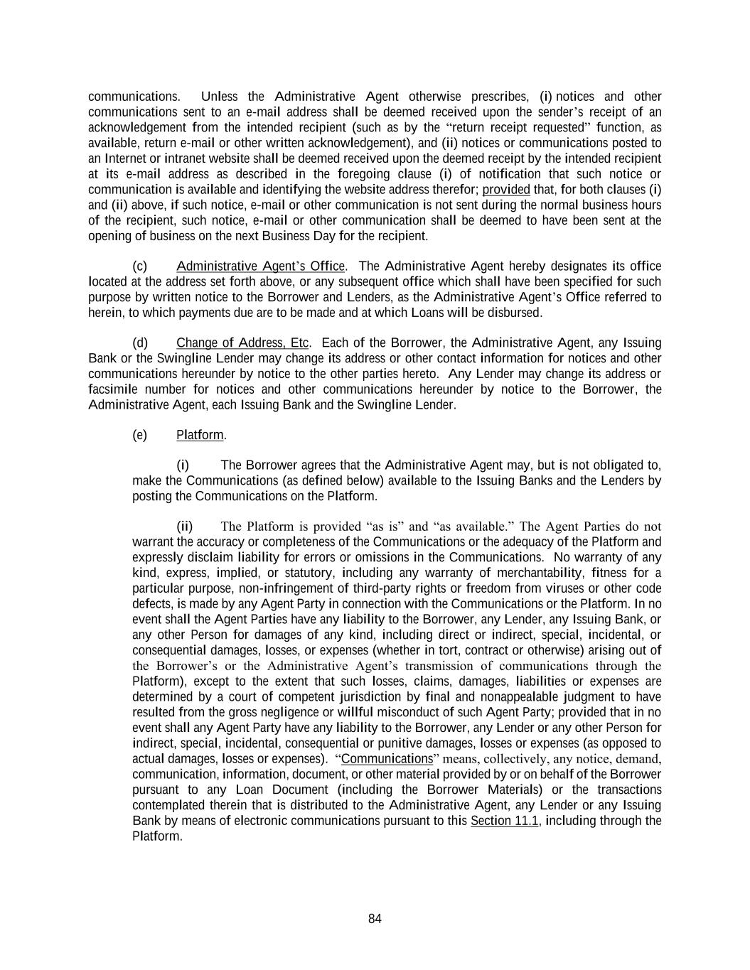 84 communications. Unless the Administrative Agent otherwise prescribes, (i) notices and other communications sent to an e-mail address shall be deemed received upon the sender’s receipt of an acknowledgement from the intended recipient (such as by the “return receipt requested” function, as available, return e-mail or other written acknowledgement), and (ii) notices or communications posted to an Internet or intranet website shall be deemed received upon the deemed receipt by the intended recipient at its e-mail address as described in the foregoing clause (i) of notification that such notice or communication is available and identifying the website address therefor; provided that, for both clauses (i) and (ii) above, if such notice, e-mail or other communication is not sent during the normal business hours of the recipient, such notice, e-mail or other communication shall be deemed to have been sent at the opening of business on the next Business Day for the recipient. (c) Administrative Agent’s Office. The Administrative Agent hereby designates its office located at the address set forth above, or any subsequent office which shall have been specified for such purpose by written notice to the Borrower and Lenders, as the Administrative Agent’s Office referred to herein, to which payments due are to be made and at which Loans will be disbursed. (d) Change of Address, Etc. Each of the Borrower, the Administrative Agent, any Issuing Bank or the Swingline Lender may change its address or other contact information for notices and other communications hereunder by notice to the other parties hereto. Any Lender may change its address or facsimile number for notices and other communications hereunder by notice to the Borrower, the Administrative Agent, each Issuing Bank and the Swingline Lender. (e) Platform. (i) The Borrower agrees that the Administrative Agent may, but is not obligated to, make the Communications (as defined below) available to the Issuing Banks and the Lenders by posting the Communications on the Platform. (ii) The Platform is provided “as is” and “as available.” The Agent Parties do not warrant the accuracy or completeness of the Communications or the adequacy of the Platform and expressly disclaim liability for errors or omissions in the Communications. No warranty of any kind, express, implied, or statutory, including any warranty of merchantability, fitness for a particular purpose, non-infringement of third-party rights or freedom from viruses or other code defects, is made by any Agent Party in connection with the Communications or the Platform. In no event shall the Agent Parties have any liability to the Borrower, any Lender, any Issuing Bank, or any other Person for damages of any kind, including direct or indirect, special, incidental, or consequential damages, losses, or expenses (whether in tort, contract or otherwise) arising out of the Borrower’s or the Administrative Agent’s transmission of communications through the Platform), except to the extent that such losses, claims, damages, liabilities or expenses are determined by a court of competent jurisdiction by final and nonappealable judgment to have resulted from the gross negligence or willful misconduct of such Agent Party; provided that in no event shall any Agent Party have any liability to the Borrower, any Lender or any other Person for indirect, special, incidental, consequential or punitive damages, losses or expenses (as opposed to actual damages, losses or expenses). “Communications” means, collectively, any notice, demand, communication, information, document, or other material provided by or on behalf of the Borrower pursuant to any Loan Document (including the Borrower Materials) or the transactions contemplated therein that is distributed to the Administrative Agent, any Lender or any Issuing Bank by means of electronic communications pursuant to this Section 11.1, including through the Platform.
