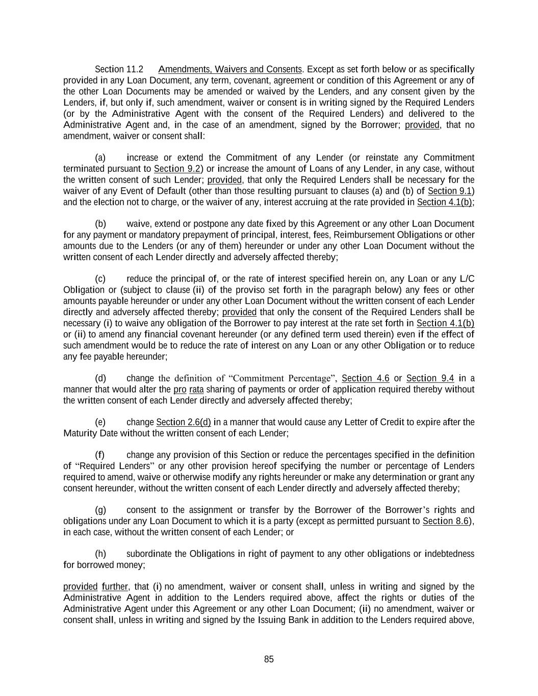 85 Section 11.2 Amendments, Waivers and Consents. Except as set forth below or as specifically provided in any Loan Document, any term, covenant, agreement or condition of this Agreement or any of the other Loan Documents may be amended or waived by the Lenders, and any consent given by the Lenders, if, but only if, such amendment, waiver or consent is in writing signed by the Required Lenders (or by the Administrative Agent with the consent of the Required Lenders) and delivered to the Administrative Agent and, in the case of an amendment, signed by the Borrower; provided, that no amendment, waiver or consent shall: (a) increase or extend the Commitment of any Lender (or reinstate any Commitment terminated pursuant to Section 9.2) or increase the amount of Loans of any Lender, in any case, without the written consent of such Lender; provided, that only the Required Lenders shall be necessary for the waiver of any Event of Default (other than those resulting pursuant to clauses (a) and (b) of Section 9.1) and the election not to charge, or the waiver of any, interest accruing at the rate provided in Section 4.1(b); (b) waive, extend or postpone any date fixed by this Agreement or any other Loan Document for any payment or mandatory prepayment of principal, interest, fees, Reimbursement Obligations or other amounts due to the Lenders (or any of them) hereunder or under any other Loan Document without the written consent of each Lender directly and adversely affected thereby; (c) reduce the principal of, or the rate of interest specified herein on, any Loan or any L/C Obligation or (subject to clause (ii) of the proviso set forth in the paragraph below) any fees or other amounts payable hereunder or under any other Loan Document without the written consent of each Lender directly and adversely affected thereby; provided that only the consent of the Required Lenders shall be necessary (i) to waive any obligation of the Borrower to pay interest at the rate set forth in Section 4.1(b) or (ii) to amend any financial covenant hereunder (or any defined term used therein) even if the effect of such amendment would be to reduce the rate of interest on any Loan or any other Obligation or to reduce any fee payable hereunder; (d) change the definition of “Commitment Percentage”, Section 4.6 or Section 9.4 in a manner that would alter the pro rata sharing of payments or order of application required thereby without the written consent of each Lender directly and adversely affected thereby; (e) change Section 2.6(d) in a manner that would cause any Letter of Credit to expire after the Maturity Date without the written consent of each Lender; (f) change any provision of this Section or reduce the percentages specified in the definition of “Required Lenders” or any other provision hereof specifying the number or percentage of Lenders required to amend, waive or otherwise modify any rights hereunder or make any determination or grant any consent hereunder, without the written consent of each Lender directly and adversely affected thereby; (g) consent to the assignment or transfer by the Borrower of the Borrower’s rights and obligations under any Loan Document to which it is a party (except as permitted pursuant to Section 8.6), in each case, without the written consent of each Lender; or (h) subordinate the Obligations in right of payment to any other obligations or indebtedness for borrowed money; provided further, that (i) no amendment, waiver or consent shall, unless in writing and signed by the Administrative Agent in addition to the Lenders required above, affect the rights or duties of the Administrative Agent under this Agreement or any other Loan Document; (ii) no amendment, waiver or consent shall, unless in writing and signed by the Issuing Bank in addition to the Lenders required above,