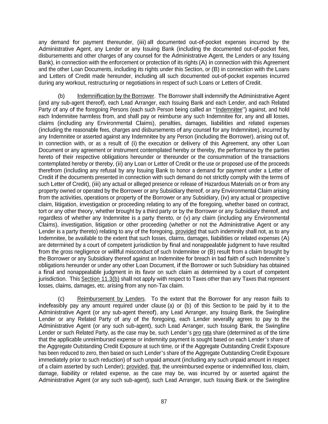 87 any demand for payment thereunder, (iii) all documented out-of-pocket expenses incurred by the Administrative Agent, any Lender or any Issuing Bank (including the documented out-of-pocket fees, disbursements and other charges of any counsel for the Administrative Agent, the Lenders or any Issuing Bank), in connection with the enforcement or protection of its rights (A) in connection with this Agreement and the other Loan Documents, including its rights under this Section, or (B) in connection with the Loans and Letters of Credit made hereunder, including all such documented out-of-pocket expenses incurred during any workout, restructuring or negotiations in respect of such Loans or Letters of Credit. (b) Indemnification by the Borrower. The Borrower shall indemnify the Administrative Agent (and any sub-agent thereof), each Lead Arranger, each Issuing Bank and each Lender, and each Related Party of any of the foregoing Persons (each such Person being called an “Indemnitee”) against, and hold each Indemnitee harmless from, and shall pay or reimburse any such Indemnitee for, any and all losses, claims (including any Environmental Claims), penalties, damages, liabilities and related expenses (including the reasonable fees, charges and disbursements of any counsel for any Indemnitee), incurred by any Indemnitee or asserted against any Indemnitee by any Person (including the Borrower), arising out of, in connection with, or as a result of (i) the execution or delivery of this Agreement, any other Loan Document or any agreement or instrument contemplated hereby or thereby, the performance by the parties hereto of their respective obligations hereunder or thereunder or the consummation of the transactions contemplated hereby or thereby, (ii) any Loan or Letter of Credit or the use or proposed use of the proceeds therefrom (including any refusal by any Issuing Bank to honor a demand for payment under a Letter of Credit if the documents presented in connection with such demand do not strictly comply with the terms of such Letter of Credit), (iii) any actual or alleged presence or release of Hazardous Materials on or from any property owned or operated by the Borrower or any Subsidiary thereof, or any Environmental Claim arising from the activities, operations or property of the Borrower or any Subsidiary, (iv) any actual or prospective claim, litigation, investigation or proceeding relating to any of the foregoing, whether based on contract, tort or any other theory, whether brought by a third party or by the Borrower or any Subsidiary thereof, and regardless of whether any Indemnitee is a party thereto, or (v) any claim (including any Environmental Claims), investigation, litigation or other proceeding (whether or not the Administrative Agent or any Lender is a party thereto) relating to any of the foregoing, provided that such indemnity shall not, as to any Indemnitee, be available to the extent that such losses, claims, damages, liabilities or related expenses (A) are determined by a court of competent jurisdiction by final and nonappealable judgment to have resulted from the gross negligence or willful misconduct of such Indemnitee or (B) result from a claim brought by the Borrower or any Subsidiary thereof against an Indemnitee for breach in bad faith of such Indemnitee’s obligations hereunder or under any other Loan Document, if the Borrower or such Subsidiary has obtained a final and nonappealable judgment in its favor on such claim as determined by a court of competent jurisdiction. This Section 11.3(b) shall not apply with respect to Taxes other than any Taxes that represent losses, claims, damages, etc. arising from any non-Tax claim. (c) Reimbursement by Lenders. To the extent that the Borrower for any reason fails to indefeasibly pay any amount required under clause (a) or (b) of this Section to be paid by it to the Administrative Agent (or any sub-agent thereof), any Lead Arranger, any Issuing Bank, the Swingline Lender or any Related Party of any of the foregoing, each Lender severally agrees to pay to the Administrative Agent (or any such sub-agent), such Lead Arranger, such Issuing Bank, the Swingline Lender or such Related Party, as the case may be, such Lender’s pro rata share (determined as of the time that the applicable unreimbursed expense or indemnity payment is sought based on each Lender’s share of the Aggregate Outstanding Credit Exposure at such time, or if the Aggregate Outstanding Credit Exposure has been reduced to zero, then based on such Lender’s share of the Aggregate Outstanding Credit Exposure immediately prior to such reduction) of such unpaid amount (including any such unpaid amount in respect of a claim asserted by such Lender); provided, that, the unreimbursed expense or indemnified loss, claim, damage, liability or related expense, as the case may be, was incurred by or asserted against the Administrative Agent (or any such sub-agent), such Lead Arranger, such Issuing Bank or the Swingline