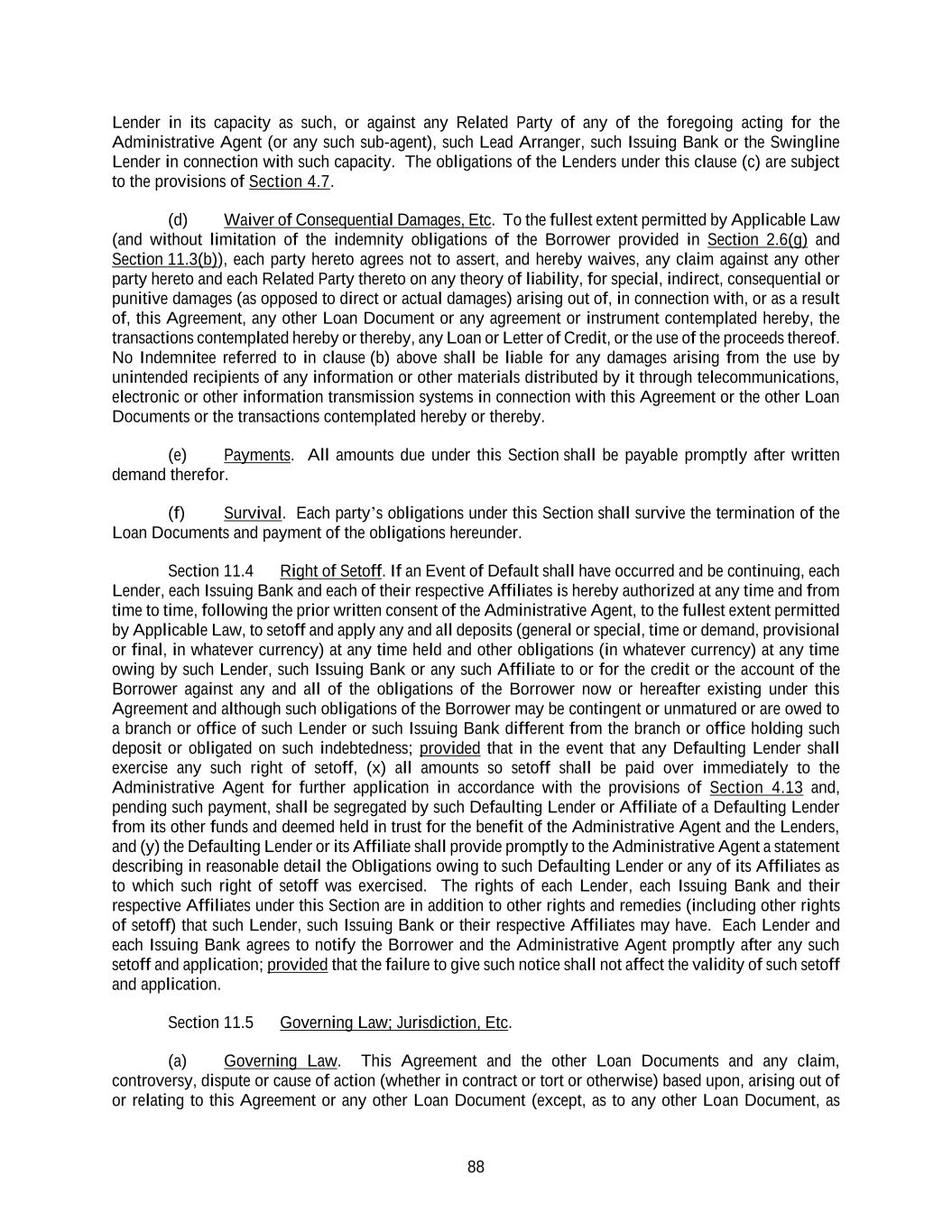 88 Lender in its capacity as such, or against any Related Party of any of the foregoing acting for the Administrative Agent (or any such sub-agent), such Lead Arranger, such Issuing Bank or the Swingline Lender in connection with such capacity. The obligations of the Lenders under this clause (c) are subject to the provisions of Section 4.7. (d) Waiver of Consequential Damages, Etc. To the fullest extent permitted by Applicable Law (and without limitation of the indemnity obligations of the Borrower provided in Section 2.6(g) and Section 11.3(b)), each party hereto agrees not to assert, and hereby waives, any claim against any other party hereto and each Related Party thereto on any theory of liability, for special, indirect, consequential or punitive damages (as opposed to direct or actual damages) arising out of, in connection with, or as a result of, this Agreement, any other Loan Document or any agreement or instrument contemplated hereby, the transactions contemplated hereby or thereby, any Loan or Letter of Credit, or the use of the proceeds thereof. No Indemnitee referred to in clause (b) above shall be liable for any damages arising from the use by unintended recipients of any information or other materials distributed by it through telecommunications, electronic or other information transmission systems in connection with this Agreement or the other Loan Documents or the transactions contemplated hereby or thereby. (e) Payments. All amounts due under this Section shall be payable promptly after written demand therefor. (f) Survival. Each party’s obligations under this Section shall survive the termination of the Loan Documents and payment of the obligations hereunder. Section 11.4 Right of Setoff. If an Event of Default shall have occurred and be continuing, each Lender, each Issuing Bank and each of their respective Affiliates is hereby authorized at any time and from time to time, following the prior written consent of the Administrative Agent, to the fullest extent permitted by Applicable Law, to setoff and apply any and all deposits (general or special, time or demand, provisional or final, in whatever currency) at any time held and other obligations (in whatever currency) at any time owing by such Lender, such Issuing Bank or any such Affiliate to or for the credit or the account of the Borrower against any and all of the obligations of the Borrower now or hereafter existing under this Agreement and although such obligations of the Borrower may be contingent or unmatured or are owed to a branch or office of such Lender or such Issuing Bank different from the branch or office holding such deposit or obligated on such indebtedness; provided that in the event that any Defaulting Lender shall exercise any such right of setoff, (x) all amounts so setoff shall be paid over immediately to the Administrative Agent for further application in accordance with the provisions of Section 4.13 and, pending such payment, shall be segregated by such Defaulting Lender or Affiliate of a Defaulting Lender from its other funds and deemed held in trust for the benefit of the Administrative Agent and the Lenders, and (y) the Defaulting Lender or its Affiliate shall provide promptly to the Administrative Agent a statement describing in reasonable detail the Obligations owing to such Defaulting Lender or any of its Affiliates as to which such right of setoff was exercised. The rights of each Lender, each Issuing Bank and their respective Affiliates under this Section are in addition to other rights and remedies (including other rights of setoff) that such Lender, such Issuing Bank or their respective Affiliates may have. Each Lender and each Issuing Bank agrees to notify the Borrower and the Administrative Agent promptly after any such setoff and application; provided that the failure to give such notice shall not affect the validity of such setoff and application. Section 11.5 Governing Law; Jurisdiction, Etc. (a) Governing Law. This Agreement and the other Loan Documents and any claim, controversy, dispute or cause of action (whether in contract or tort or otherwise) based upon, arising out of or relating to this Agreement or any other Loan Document (except, as to any other Loan Document, as