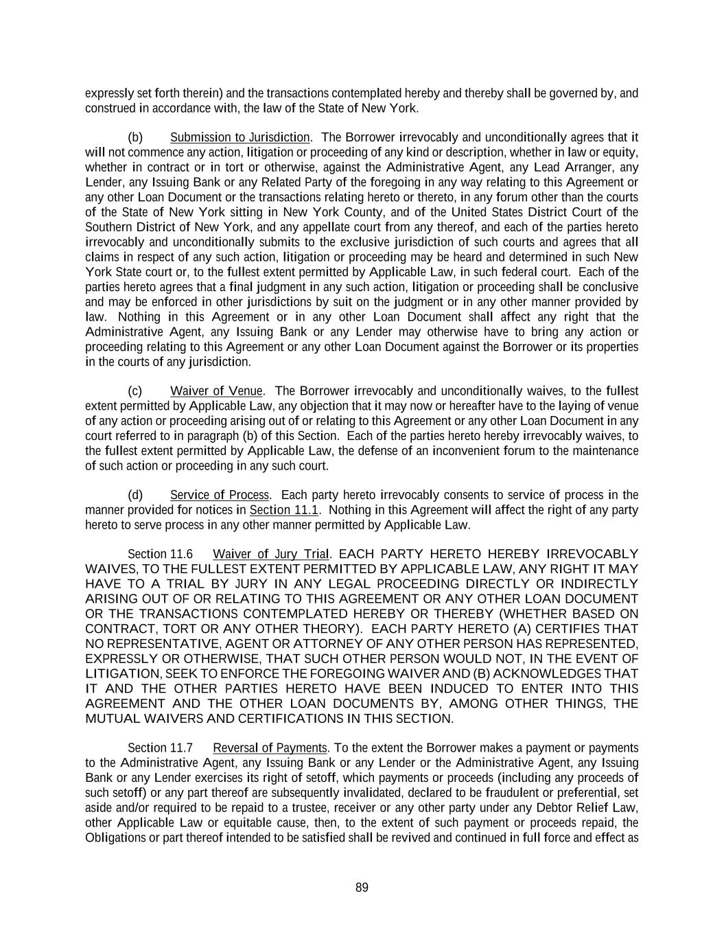 89 expressly set forth therein) and the transactions contemplated hereby and thereby shall be governed by, and construed in accordance with, the law of the State of New York. (b) Submission to Jurisdiction. The Borrower irrevocably and unconditionally agrees that it will not commence any action, litigation or proceeding of any kind or description, whether in law or equity, whether in contract or in tort or otherwise, against the Administrative Agent, any Lead Arranger, any Lender, any Issuing Bank or any Related Party of the foregoing in any way relating to this Agreement or any other Loan Document or the transactions relating hereto or thereto, in any forum other than the courts of the State of New York sitting in New York County, and of the United States District Court of the Southern District of New York, and any appellate court from any thereof, and each of the parties hereto irrevocably and unconditionally submits to the exclusive jurisdiction of such courts and agrees that all claims in respect of any such action, litigation or proceeding may be heard and determined in such New York State court or, to the fullest extent permitted by Applicable Law, in such federal court. Each of the parties hereto agrees that a final judgment in any such action, litigation or proceeding shall be conclusive and may be enforced in other jurisdictions by suit on the judgment or in any other manner provided by law. Nothing in this Agreement or in any other Loan Document shall affect any right that the Administrative Agent, any Issuing Bank or any Lender may otherwise have to bring any action or proceeding relating to this Agreement or any other Loan Document against the Borrower or its properties in the courts of any jurisdiction. (c) Waiver of Venue. The Borrower irrevocably and unconditionally waives, to the fullest extent permitted by Applicable Law, any objection that it may now or hereafter have to the laying of venue of any action or proceeding arising out of or relating to this Agreement or any other Loan Document in any court referred to in paragraph (b) of this Section. Each of the parties hereto hereby irrevocably waives, to the fullest extent permitted by Applicable Law, the defense of an inconvenient forum to the maintenance of such action or proceeding in any such court. (d) Service of Process. Each party hereto irrevocably consents to service of process in the manner provided for notices in Section 11.1. Nothing in this Agreement will affect the right of any party hereto to serve process in any other manner permitted by Applicable Law. Section 11.6 Waiver of Jury Trial. EACH PARTY HERETO HEREBY IRREVOCABLY WAIVES, TO THE FULLEST EXTENT PERMITTED BY APPLICABLE LAW, ANY RIGHT IT MAY HAVE TO A TRIAL BY JURY IN ANY LEGAL PROCEEDING DIRECTLY OR INDIRECTLY ARISING OUT OF OR RELATING TO THIS AGREEMENT OR ANY OTHER LOAN DOCUMENT OR THE TRANSACTIONS CONTEMPLATED HEREBY OR THEREBY (WHETHER BASED ON CONTRACT, TORT OR ANY OTHER THEORY). EACH PARTY HERETO (A) CERTIFIES THAT NO REPRESENTATIVE, AGENT OR ATTORNEY OF ANY OTHER PERSON HAS REPRESENTED, EXPRESSLY OR OTHERWISE, THAT SUCH OTHER PERSON WOULD NOT, IN THE EVENT OF LITIGATION, SEEK TO ENFORCE THE FOREGOING WAIVER AND (B) ACKNOWLEDGES THAT IT AND THE OTHER PARTIES HERETO HAVE BEEN INDUCED TO ENTER INTO THIS AGREEMENT AND THE OTHER LOAN DOCUMENTS BY, AMONG OTHER THINGS, THE MUTUAL WAIVERS AND CERTIFICATIONS IN THIS SECTION. Section 11.7 Reversal of Payments. To the extent the Borrower makes a payment or payments to the Administrative Agent, any Issuing Bank or any Lender or the Administrative Agent, any Issuing Bank or any Lender exercises its right of setoff, which payments or proceeds (including any proceeds of such setoff) or any part thereof are subsequently invalidated, declared to be fraudulent or preferential, set aside and/or required to be repaid to a trustee, receiver or any other party under any Debtor Relief Law, other Applicable Law or equitable cause, then, to the extent of such payment or proceeds repaid, the Obligations or part thereof intended to be satisfied shall be revived and continued in full force and effect as