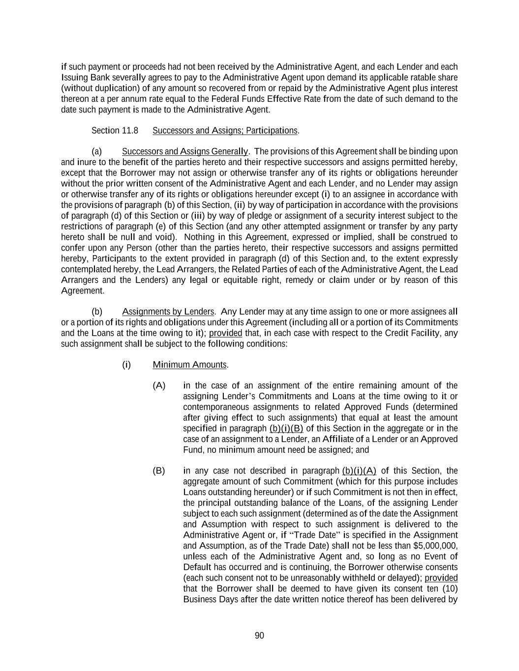 90 if such payment or proceeds had not been received by the Administrative Agent, and each Lender and each Issuing Bank severally agrees to pay to the Administrative Agent upon demand its applicable ratable share (without duplication) of any amount so recovered from or repaid by the Administrative Agent plus interest thereon at a per annum rate equal to the Federal Funds Effective Rate from the date of such demand to the date such payment is made to the Administrative Agent. Section 11.8 Successors and Assigns; Participations. (a) Successors and Assigns Generally. The provisions of this Agreement shall be binding upon and inure to the benefit of the parties hereto and their respective successors and assigns permitted hereby, except that the Borrower may not assign or otherwise transfer any of its rights or obligations hereunder without the prior written consent of the Administrative Agent and each Lender, and no Lender may assign or otherwise transfer any of its rights or obligations hereunder except (i) to an assignee in accordance with the provisions of paragraph (b) of this Section, (ii) by way of participation in accordance with the provisions of paragraph (d) of this Section or (iii) by way of pledge or assignment of a security interest subject to the restrictions of paragraph (e) of this Section (and any other attempted assignment or transfer by any party hereto shall be null and void). Nothing in this Agreement, expressed or implied, shall be construed to confer upon any Person (other than the parties hereto, their respective successors and assigns permitted hereby, Participants to the extent provided in paragraph (d) of this Section and, to the extent expressly contemplated hereby, the Lead Arrangers, the Related Parties of each of the Administrative Agent, the Lead Arrangers and the Lenders) any legal or equitable right, remedy or claim under or by reason of this Agreement. (b) Assignments by Lenders. Any Lender may at any time assign to one or more assignees all or a portion of its rights and obligations under this Agreement (including all or a portion of its Commitments and the Loans at the time owing to it); provided that, in each case with respect to the Credit Facility, any such assignment shall be subject to the following conditions: (i) Minimum Amounts. (A) in the case of an assignment of the entire remaining amount of the assigning Lender’s Commitments and Loans at the time owing to it or contemporaneous assignments to related Approved Funds (determined after giving effect to such assignments) that equal at least the amount specified in paragraph (b)(i)(B) of this Section in the aggregate or in the case of an assignment to a Lender, an Affiliate of a Lender or an Approved Fund, no minimum amount need be assigned; and (B) in any case not described in paragraph (b)(i)(A) of this Section, the aggregate amount of such Commitment (which for this purpose includes Loans outstanding hereunder) or if such Commitment is not then in effect, the principal outstanding balance of the Loans, of the assigning Lender subject to each such assignment (determined as of the date the Assignment and Assumption with respect to such assignment is delivered to the Administrative Agent or, if “Trade Date” is specified in the Assignment and Assumption, as of the Trade Date) shall not be less than $5,000,000, unless each of the Administrative Agent and, so long as no Event of Default has occurred and is continuing, the Borrower otherwise consents (each such consent not to be unreasonably withheld or delayed); provided that the Borrower shall be deemed to have given its consent ten (10) Business Days after the date written notice thereof has been delivered by