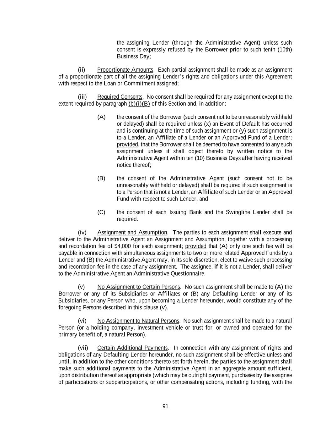 91 the assigning Lender (through the Administrative Agent) unless such consent is expressly refused by the Borrower prior to such tenth (10th) Business Day; (ii) Proportionate Amounts. Each partial assignment shall be made as an assignment of a proportionate part of all the assigning Lender’s rights and obligations under this Agreement with respect to the Loan or Commitment assigned; (iii) Required Consents. No consent shall be required for any assignment except to the extent required by paragraph (b)(i)(B) of this Section and, in addition: (A) the consent of the Borrower (such consent not to be unreasonably withheld or delayed) shall be required unless (x) an Event of Default has occurred and is continuing at the time of such assignment or (y) such assignment is to a Lender, an Affiliate of a Lender or an Approved Fund of a Lender; provided, that the Borrower shall be deemed to have consented to any such assignment unless it shall object thereto by written notice to the Administrative Agent within ten (10) Business Days after having received notice thereof; (B) the consent of the Administrative Agent (such consent not to be unreasonably withheld or delayed) shall be required if such assignment is to a Person that is not a Lender, an Affiliate of such Lender or an Approved Fund with respect to such Lender; and (C) the consent of each Issuing Bank and the Swingline Lender shall be required. (iv) Assignment and Assumption. The parties to each assignment shall execute and deliver to the Administrative Agent an Assignment and Assumption, together with a processing and recordation fee of $4,000 for each assignment; provided that (A) only one such fee will be payable in connection with simultaneous assignments to two or more related Approved Funds by a Lender and (B) the Administrative Agent may, in its sole discretion, elect to waive such processing and recordation fee in the case of any assignment. The assignee, if it is not a Lender, shall deliver to the Administrative Agent an Administrative Questionnaire. (v) No Assignment to Certain Persons. No such assignment shall be made to (A) the Borrower or any of its Subsidiaries or Affiliates or (B) any Defaulting Lender or any of its Subsidiaries, or any Person who, upon becoming a Lender hereunder, would constitute any of the foregoing Persons described in this clause (v). (vi) No Assignment to Natural Persons. No such assignment shall be made to a natural Person (or a holding company, investment vehicle or trust for, or owned and operated for the primary benefit of, a natural Person). (vii) Certain Additional Payments. In connection with any assignment of rights and obligations of any Defaulting Lender hereunder, no such assignment shall be effective unless and until, in addition to the other conditions thereto set forth herein, the parties to the assignment shall make such additional payments to the Administrative Agent in an aggregate amount sufficient, upon distribution thereof as appropriate (which may be outright payment, purchases by the assignee of participations or subparticipations, or other compensating actions, including funding, with the