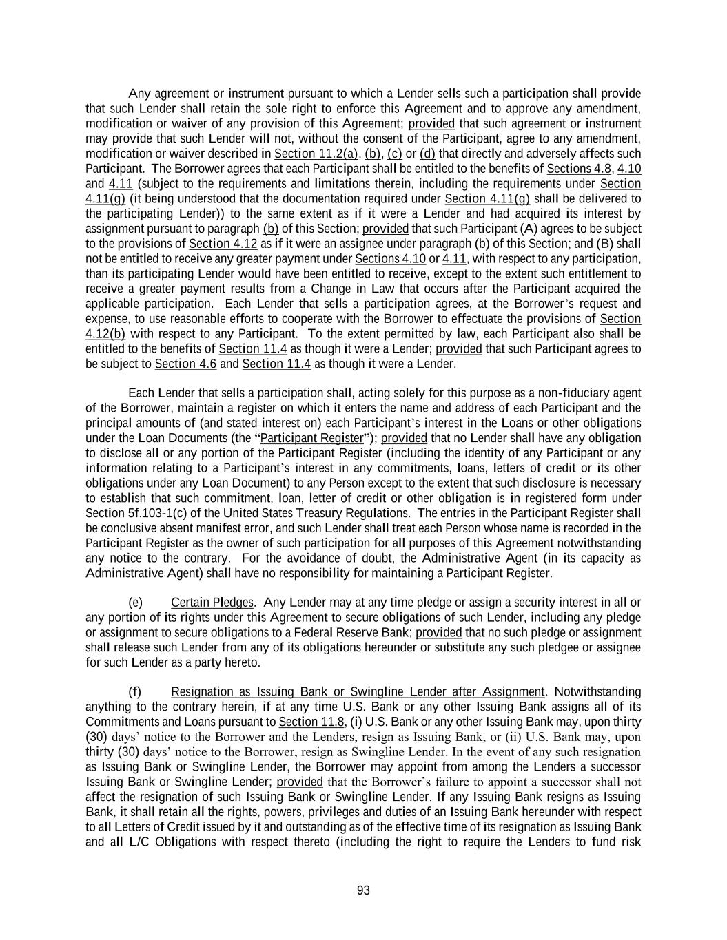 93 Any agreement or instrument pursuant to which a Lender sells such a participation shall provide that such Lender shall retain the sole right to enforce this Agreement and to approve any amendment, modification or waiver of any provision of this Agreement; provided that such agreement or instrument may provide that such Lender will not, without the consent of the Participant, agree to any amendment, modification or waiver described in Section 11.2(a), (b), (c) or (d) that directly and adversely affects such Participant. The Borrower agrees that each Participant shall be entitled to the benefits of Sections 4.8, 4.10 and 4.11 (subject to the requirements and limitations therein, including the requirements under Section 4.11(g) (it being understood that the documentation required under Section 4.11(g) shall be delivered to the participating Lender)) to the same extent as if it were a Lender and had acquired its interest by assignment pursuant to paragraph (b) of this Section; provided that such Participant (A) agrees to be subject to the provisions of Section 4.12 as if it were an assignee under paragraph (b) of this Section; and (B) shall not be entitled to receive any greater payment under Sections 4.10 or 4.11, with respect to any participation, than its participating Lender would have been entitled to receive, except to the extent such entitlement to receive a greater payment results from a Change in Law that occurs after the Participant acquired the applicable participation. Each Lender that sells a participation agrees, at the Borrower’s request and expense, to use reasonable efforts to cooperate with the Borrower to effectuate the provisions of Section 4.12(b) with respect to any Participant. To the extent permitted by law, each Participant also shall be entitled to the benefits of Section 11.4 as though it were a Lender; provided that such Participant agrees to be subject to Section 4.6 and Section 11.4 as though it were a Lender. Each Lender that sells a participation shall, acting solely for this purpose as a non-fiduciary agent of the Borrower, maintain a register on which it enters the name and address of each Participant and the principal amounts of (and stated interest on) each Participant’s interest in the Loans or other obligations under the Loan Documents (the “Participant Register”); provided that no Lender shall have any obligation to disclose all or any portion of the Participant Register (including the identity of any Participant or any information relating to a Participant’s interest in any commitments, loans, letters of credit or its other obligations under any Loan Document) to any Person except to the extent that such disclosure is necessary to establish that such commitment, loan, letter of credit or other obligation is in registered form under Section 5f.103-1(c) of the United States Treasury Regulations. The entries in the Participant Register shall be conclusive absent manifest error, and such Lender shall treat each Person whose name is recorded in the Participant Register as the owner of such participation for all purposes of this Agreement notwithstanding any notice to the contrary. For the avoidance of doubt, the Administrative Agent (in its capacity as Administrative Agent) shall have no responsibility for maintaining a Participant Register. (e) Certain Pledges. Any Lender may at any time pledge or assign a security interest in all or any portion of its rights under this Agreement to secure obligations of such Lender, including any pledge or assignment to secure obligations to a Federal Reserve Bank; provided that no such pledge or assignment shall release such Lender from any of its obligations hereunder or substitute any such pledgee or assignee for such Lender as a party hereto. (f) Resignation as Issuing Bank or Swingline Lender after Assignment. Notwithstanding anything to the contrary herein, if at any time U.S. Bank or any other Issuing Bank assigns all of its Commitments and Loans pursuant to Section 11.8, (i) U.S. Bank or any other Issuing Bank may, upon thirty (30) days’ notice to the Borrower and the Lenders, resign as Issuing Bank, or (ii) U.S. Bank may, upon thirty (30) days’ notice to the Borrower, resign as Swingline Lender. In the event of any such resignation as Issuing Bank or Swingline Lender, the Borrower may appoint from among the Lenders a successor Issuing Bank or Swingline Lender; provided that the Borrower’s failure to appoint a successor shall not affect the resignation of such Issuing Bank or Swingline Lender. If any Issuing Bank resigns as Issuing Bank, it shall retain all the rights, powers, privileges and duties of an Issuing Bank hereunder with respect to all Letters of Credit issued by it and outstanding as of the effective time of its resignation as Issuing Bank and all L/C Obligations with respect thereto (including the right to require the Lenders to fund risk