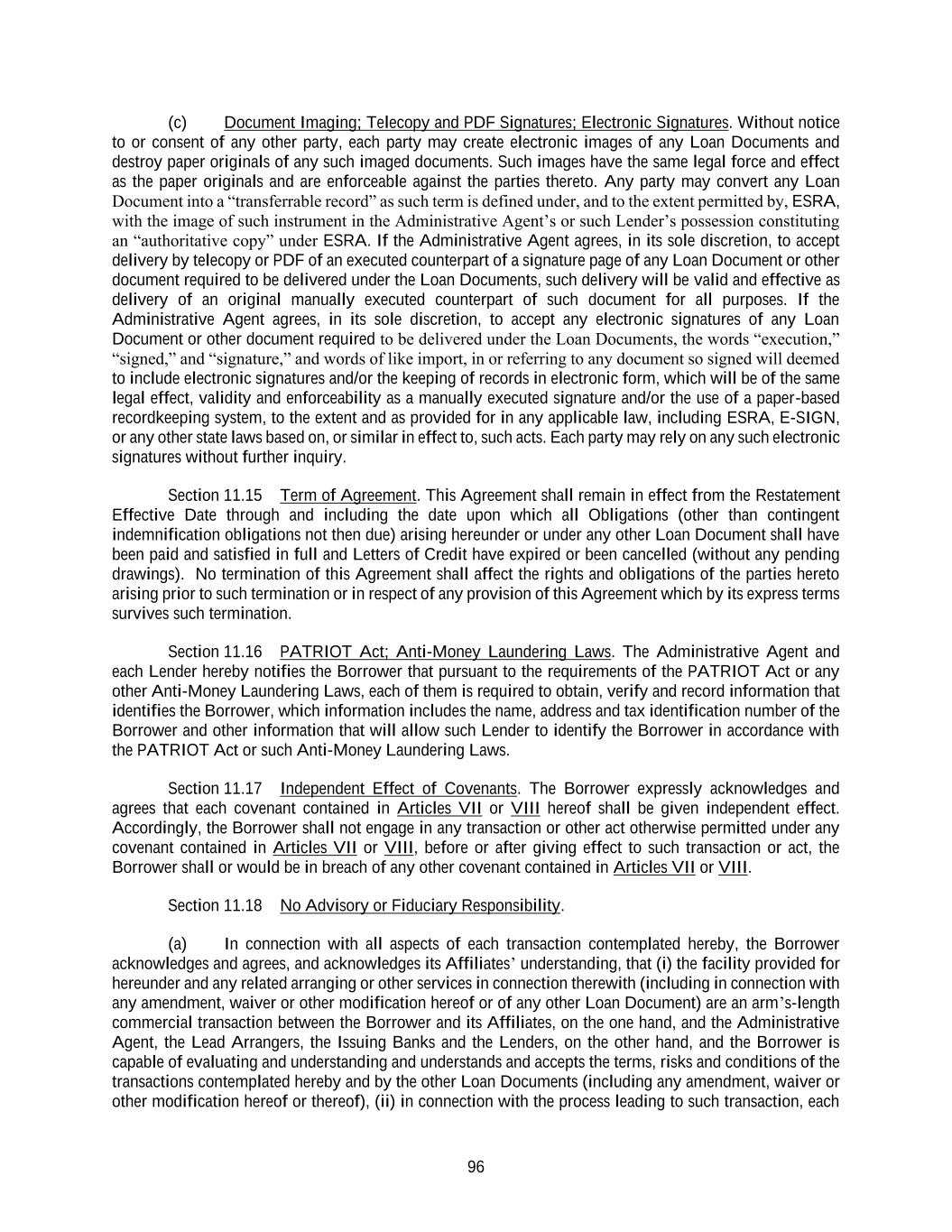 96 (c) Document Imaging; Telecopy and PDF Signatures; Electronic Signatures. Without notice to or consent of any other party, each party may create electronic images of any Loan Documents and destroy paper originals of any such imaged documents. Such images have the same legal force and effect as the paper originals and are enforceable against the parties thereto. Any party may convert any Loan Document into a “transferrable record” as such term is defined under, and to the extent permitted by, ESRA, with the image of such instrument in the Administrative Agent’s or such Lender’s possession constituting an “authoritative copy” under ESRA. If the Administrative Agent agrees, in its sole discretion, to accept delivery by telecopy or PDF of an executed counterpart of a signature page of any Loan Document or other document required to be delivered under the Loan Documents, such delivery will be valid and effective as delivery of an original manually executed counterpart of such document for all purposes. If the Administrative Agent agrees, in its sole discretion, to accept any electronic signatures of any Loan Document or other document required to be delivered under the Loan Documents, the words “execution,” “signed,” and “signature,” and words of like import, in or referring to any document so signed will deemed to include electronic signatures and/or the keeping of records in electronic form, which will be of the same legal effect, validity and enforceability as a manually executed signature and/or the use of a paper-based recordkeeping system, to the extent and as provided for in any applicable law, including ESRA, E-SIGN, or any other state laws based on, or similar in effect to, such acts. Each party may rely on any such electronic signatures without further inquiry. Section 11.15 Term of Agreement. This Agreement shall remain in effect from the Restatement Effective Date through and including the date upon which all Obligations (other than contingent indemnification obligations not then due) arising hereunder or under any other Loan Document shall have been paid and satisfied in full and Letters of Credit have expired or been cancelled (without any pending drawings). No termination of this Agreement shall affect the rights and obligations of the parties hereto arising prior to such termination or in respect of any provision of this Agreement which by its express terms survives such termination. Section 11.16 PATRIOT Act; Anti-Money Laundering Laws. The Administrative Agent and each Lender hereby notifies the Borrower that pursuant to the requirements of the PATRIOT Act or any other Anti-Money Laundering Laws, each of them is required to obtain, verify and record information that identifies the Borrower, which information includes the name, address and tax identification number of the Borrower and other information that will allow such Lender to identify the Borrower in accordance with the PATRIOT Act or such Anti-Money Laundering Laws. Section 11.17 Independent Effect of Covenants. The Borrower expressly acknowledges and agrees that each covenant contained in Articles VII or VIII hereof shall be given independent effect. Accordingly, the Borrower shall not engage in any transaction or other act otherwise permitted under any covenant contained in Articles VII or VIII, before or after giving effect to such transaction or act, the Borrower shall or would be in breach of any other covenant contained in Articles VII or VIII. Section 11.18 No Advisory or Fiduciary Responsibility. (a) In connection with all aspects of each transaction contemplated hereby, the Borrower acknowledges and agrees, and acknowledges its Affiliates’ understanding, that (i) the facility provided for hereunder and any related arranging or other services in connection therewith (including in connection with any amendment, waiver or other modification hereof or of any other Loan Document) are an arm’s-length commercial transaction between the Borrower and its Affiliates, on the one hand, and the Administrative Agent, the Lead Arrangers, the Issuing Banks and the Lenders, on the other hand, and the Borrower is capable of evaluating and understanding and understands and accepts the terms, risks and conditions of the transactions contemplated hereby and by the other Loan Documents (including any amendment, waiver or other modification hereof or thereof), (ii) in connection with the process leading to such transaction, each