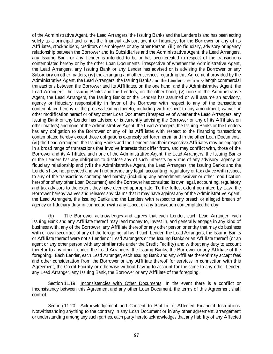 97 of the Administrative Agent, the Lead Arrangers, the Issuing Banks and the Lenders is and has been acting solely as a principal and is not the financial advisor, agent or fiduciary, for the Borrower or any of its Affiliates, stockholders, creditors or employees or any other Person, (iii) no fiduciary, advisory or agency relationship between the Borrower and its Subsidiaries and the Administrative Agent, the Lead Arrangers, any Issuing Bank or any Lender is intended to be or has been created in respect of the transactions contemplated hereby or by the other Loan Documents, irrespective of whether the Administrative Agent, the Lead Arrangers, any Issuing Bank or any Lender has advised or is advising the Borrower or any Subsidiary on other matters, (iv) the arranging and other services regarding this Agreement provided by the Administrative Agent, the Lead Arrangers, the Issuing Banks and the Lenders are arm’s-length commercial transactions between the Borrower and its Affiliates, on the one hand, and the Administrative Agent, the Lead Arrangers, the Issuing Banks and the Lenders, on the other hand, (v) none of the Administrative Agent, the Lead Arrangers, the Issuing Banks or the Lenders has assumed or will assume an advisory, agency or fiduciary responsibility in favor of the Borrower with respect to any of the transactions contemplated hereby or the process leading thereto, including with respect to any amendment, waiver or other modification hereof or of any other Loan Document (irrespective of whether the Lead Arrangers, any Issuing Bank or any Lender has advised or is currently advising the Borrower or any of its Affiliates on other matters) and none of the Administrative Agent, the Lead Arrangers, the Issuing Banks or the Lenders has any obligation to the Borrower or any of its Affiliates with respect to the financing transactions contemplated hereby except those obligations expressly set forth herein and in the other Loan Documents, (vi) the Lead Arrangers, the Issuing Banks and the Lenders and their respective Affiliates may be engaged in a broad range of transactions that involve interests that differ from, and may conflict with, those of the Borrower and its Affiliates, and none of the Administrative Agent, the Lead Arrangers, the Issuing Banks or the Lenders has any obligation to disclose any of such interests by virtue of any advisory, agency or fiduciary relationship and (vii) the Administrative Agent, the Lead Arrangers, the Issuing Banks and the Lenders have not provided and will not provide any legal, accounting, regulatory or tax advice with respect to any of the transactions contemplated hereby (including any amendment, waiver or other modification hereof or of any other Loan Document) and the Borrower has consulted its own legal, accounting, regulatory and tax advisors to the extent they have deemed appropriate. To the fullest extent permitted by Law, the Borrower hereby waives and releases any claims that it may have against any of the Administrative Agent, the Lead Arrangers, the Issuing Banks and the Lenders with respect to any breach or alleged breach of agency or fiduciary duty in connection with any aspect of any transaction contemplated hereby. (b) The Borrower acknowledges and agrees that each Lender, each Lead Arranger, each Issuing Bank and any Affiliate thereof may lend money to, invest in, and generally engage in any kind of business with, any of the Borrower, any Affiliate thereof or any other person or entity that may do business with or own securities of any of the foregoing, all as if such Lender, the Lead Arrangers, the Issuing Banks or Affiliate thereof were not a Lender or Lead Arrangers or the Issuing Banks or an Affiliate thereof (or an agent or any other person with any similar role under the Credit Facility) and without any duty to account therefor to any other Lender, the Lead Arrangers, the Issuing Banks, the Borrower or any Affiliate of the foregoing. Each Lender, each Lead Arranger, each Issuing Bank and any Affiliate thereof may accept fees and other consideration from the Borrower or any Affiliate thereof for services in connection with this Agreement, the Credit Facility or otherwise without having to account for the same to any other Lender, any Lead Arranger, any Issuing Bank, the Borrower or any Affiliate of the foregoing. Section 11.19 Inconsistencies with Other Documents. In the event there is a conflict or inconsistency between this Agreement and any other Loan Document, the terms of this Agreement shall control. Section 11.20 Acknowledgement and Consent to Bail-In of Affected Financial Institutions. Notwithstanding anything to the contrary in any Loan Document or in any other agreement, arrangement or understanding among any such parties, each party hereto acknowledges that any liability of any Affected