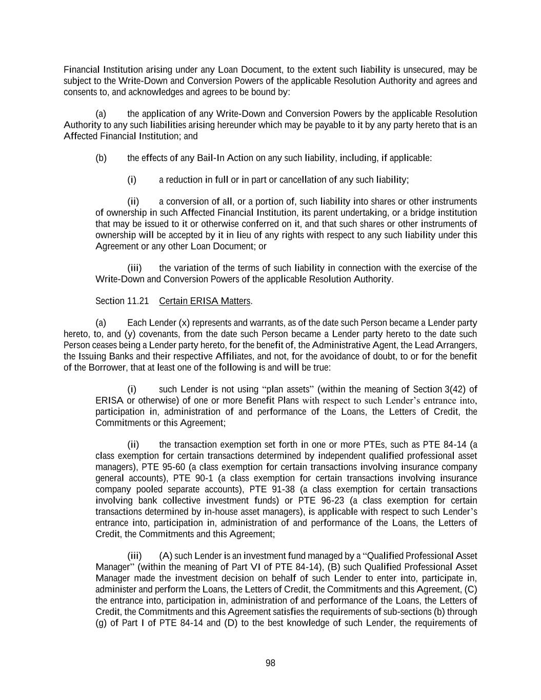 98 Financial Institution arising under any Loan Document, to the extent such liability is unsecured, may be subject to the Write-Down and Conversion Powers of the applicable Resolution Authority and agrees and consents to, and acknowledges and agrees to be bound by: (a) the application of any Write-Down and Conversion Powers by the applicable Resolution Authority to any such liabilities arising hereunder which may be payable to it by any party hereto that is an Affected Financial Institution; and (b) the effects of any Bail-In Action on any such liability, including, if applicable: (i) a reduction in full or in part or cancellation of any such liability; (ii) a conversion of all, or a portion of, such liability into shares or other instruments of ownership in such Affected Financial Institution, its parent undertaking, or a bridge institution that may be issued to it or otherwise conferred on it, and that such shares or other instruments of ownership will be accepted by it in lieu of any rights with respect to any such liability under this Agreement or any other Loan Document; or (iii) the variation of the terms of such liability in connection with the exercise of the Write-Down and Conversion Powers of the applicable Resolution Authority. Section 11.21 Certain ERISA Matters. (a) Each Lender (x) represents and warrants, as of the date such Person became a Lender party hereto, to, and (y) covenants, from the date such Person became a Lender party hereto to the date such Person ceases being a Lender party hereto, for the benefit of, the Administrative Agent, the Lead Arrangers, the Issuing Banks and their respective Affiliates, and not, for the avoidance of doubt, to or for the benefit of the Borrower, that at least one of the following is and will be true: (i) such Lender is not using “plan assets” (within the meaning of Section 3(42) of ERISA or otherwise) of one or more Benefit Plans with respect to such Lender’s entrance into, participation in, administration of and performance of the Loans, the Letters of Credit, the Commitments or this Agreement; (ii) the transaction exemption set forth in one or more PTEs, such as PTE 84-14 (a class exemption for certain transactions determined by independent qualified professional asset managers), PTE 95-60 (a class exemption for certain transactions involving insurance company general accounts), PTE 90-1 (a class exemption for certain transactions involving insurance company pooled separate accounts), PTE 91-38 (a class exemption for certain transactions involving bank collective investment funds) or PTE 96-23 (a class exemption for certain transactions determined by in-house asset managers), is applicable with respect to such Lender’s entrance into, participation in, administration of and performance of the Loans, the Letters of Credit, the Commitments and this Agreement; (iii) (A) such Lender is an investment fund managed by a “Qualified Professional Asset Manager” (within the meaning of Part VI of PTE 84-14), (B) such Qualified Professional Asset Manager made the investment decision on behalf of such Lender to enter into, participate in, administer and perform the Loans, the Letters of Credit, the Commitments and this Agreement, (C) the entrance into, participation in, administration of and performance of the Loans, the Letters of Credit, the Commitments and this Agreement satisfies the requirements of sub-sections (b) through (g) of Part I of PTE 84-14 and (D) to the best knowledge of such Lender, the requirements of