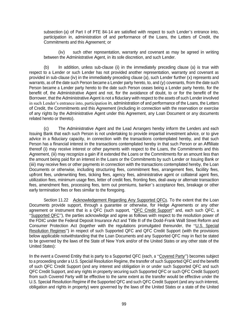 99 subsection (a) of Part I of PTE 84-14 are satisfied with respect to such Lender’s entrance into, participation in, administration of and performance of the Loans, the Letters of Credit, the Commitments and this Agreement; or (iv) such other representation, warranty and covenant as may be agreed in writing between the Administrative Agent, in its sole discretion, and such Lender. (b) In addition, unless sub-clause (i) in the immediately preceding clause (a) is true with respect to a Lender or such Lender has not provided another representation, warranty and covenant as provided in sub-clause (iv) in the immediately preceding clause (a), such Lender further (x) represents and warrants, as of the date such Person became a Lender party hereto, to, and (y) covenants, from the date such Person became a Lender party hereto to the date such Person ceases being a Lender party hereto, for the benefit of, the Administrative Agent and not, for the avoidance of doubt, to or for the benefit of the Borrower, that the Administrative Agent is not a fiduciary with respect to the assets of such Lender involved in such Lender’s entrance into, participation in, administration of and performance of the Loans, the Letters of Credit, the Commitments and this Agreement (including in connection with the reservation or exercise of any rights by the Administrative Agent under this Agreement, any Loan Document or any documents related hereto or thereto). (c) The Administrative Agent and the Lead Arrangers hereby inform the Lenders and each Issuing Bank that each such Person is not undertaking to provide impartial investment advice, or to give advice in a fiduciary capacity, in connection with the transactions contemplated hereby, and that such Person has a financial interest in the transactions contemplated hereby in that such Person or an Affiliate thereof (i) may receive interest or other payments with respect to the Loans, the Commitments and this Agreement, (ii) may recognize a gain if it extended the Loans or the Commitments for an amount less than the amount being paid for an interest in the Loans or the Commitments by such Lender or Issuing Bank or (iii) may receive fees or other payments in connection with the transactions contemplated hereby, the Loan Documents or otherwise, including structuring fees, commitment fees, arrangement fees, facility fees, upfront fees, underwriting fees, ticking fees, agency fees, administrative agent or collateral agent fees, utilization fees, minimum usage fees, letter of credit fees, fronting fees, deal-away or alternate transaction fees, amendment fees, processing fees, term out premiums, banker’s acceptance fees, breakage or other early termination fees or fees similar to the foregoing. Section 11.22 Acknowledgement Regarding Any Supported QFCs. To the extent that the Loan Documents provide support, through a guarantee or otherwise, for Hedge Agreements or any other agreement or instrument that is a QFC (such support, “QFC Credit Support” and, each such QFC, a “Supported QFC”), the parties acknowledge and agree as follows with respect to the resolution power of the FDIC under the Federal Deposit Insurance Act and Title II of the Dodd-Frank Wall Street Reform and Consumer Protection Act (together with the regulations promulgated thereunder, the “U.S. Special Resolution Regimes”) in respect of such Supported QFC and QFC Credit Support (with the provisions below applicable notwithstanding that the Loan Documents and any Supported QFC may in fact be stated to be governed by the laws of the State of New York and/or of the United States or any other state of the United States): In the event a Covered Entity that is party to a Supported QFC (each, a “Covered Party”) becomes subject to a proceeding under a U.S. Special Resolution Regime, the transfer of such Supported QFC and the benefit of such QFC Credit Support (and any interest and obligation in or under such Supported QFC and such QFC Credit Support, and any rights in property securing such Supported QFC or such QFC Credit Support) from such Covered Party will be effective to the same extent as the transfer would be effective under the U.S. Special Resolution Regime if the Supported QFC and such QFC Credit Support (and any such interest, obligation and rights in property) were governed by the laws of the United States or a state of the United