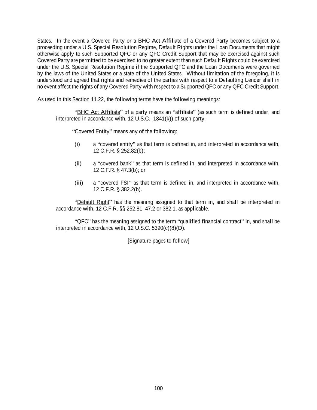 100 States. In the event a Covered Party or a BHC Act Affiliate of a Covered Party becomes subject to a proceeding under a U.S. Special Resolution Regime, Default Rights under the Loan Documents that might otherwise apply to such Supported QFC or any QFC Credit Support that may be exercised against such Covered Party are permitted to be exercised to no greater extent than such Default Rights could be exercised under the U.S. Special Resolution Regime if the Supported QFC and the Loan Documents were governed by the laws of the United States or a state of the United States. Without limitation of the foregoing, it is understood and agreed that rights and remedies of the parties with respect to a Defaulting Lender shall in no event affect the rights of any Covered Party with respect to a Supported QFC or any QFC Credit Support. As used in this Section 11.22, the following terms have the following meanings: “BHC Act Affiliate” of a party means an “affiliate” (as such term is defined under, and interpreted in accordance with, 12 U.S.C. 1841(k)) of such party. “Covered Entity” means any of the following: (i) a “covered entity” as that term is defined in, and interpreted in accordance with, 12 C.F.R. § 252.82(b); (ii) a “covered bank” as that term is defined in, and interpreted in accordance with, 12 C.F.R. § 47.3(b); or (iii) a “covered FSI” as that term is defined in, and interpreted in accordance with, 12 C.F.R. § 382.2(b). “Default Right” has the meaning assigned to that term in, and shall be interpreted in accordance with, 12 C.F.R. §§ 252.81, 47.2 or 382.1, as applicable. “QFC” has the meaning assigned to the term “qualified financial contract” in, and shall be interpreted in accordance with, 12 U.S.C. 5390(c)(8)(D). [Signature pages to follow]