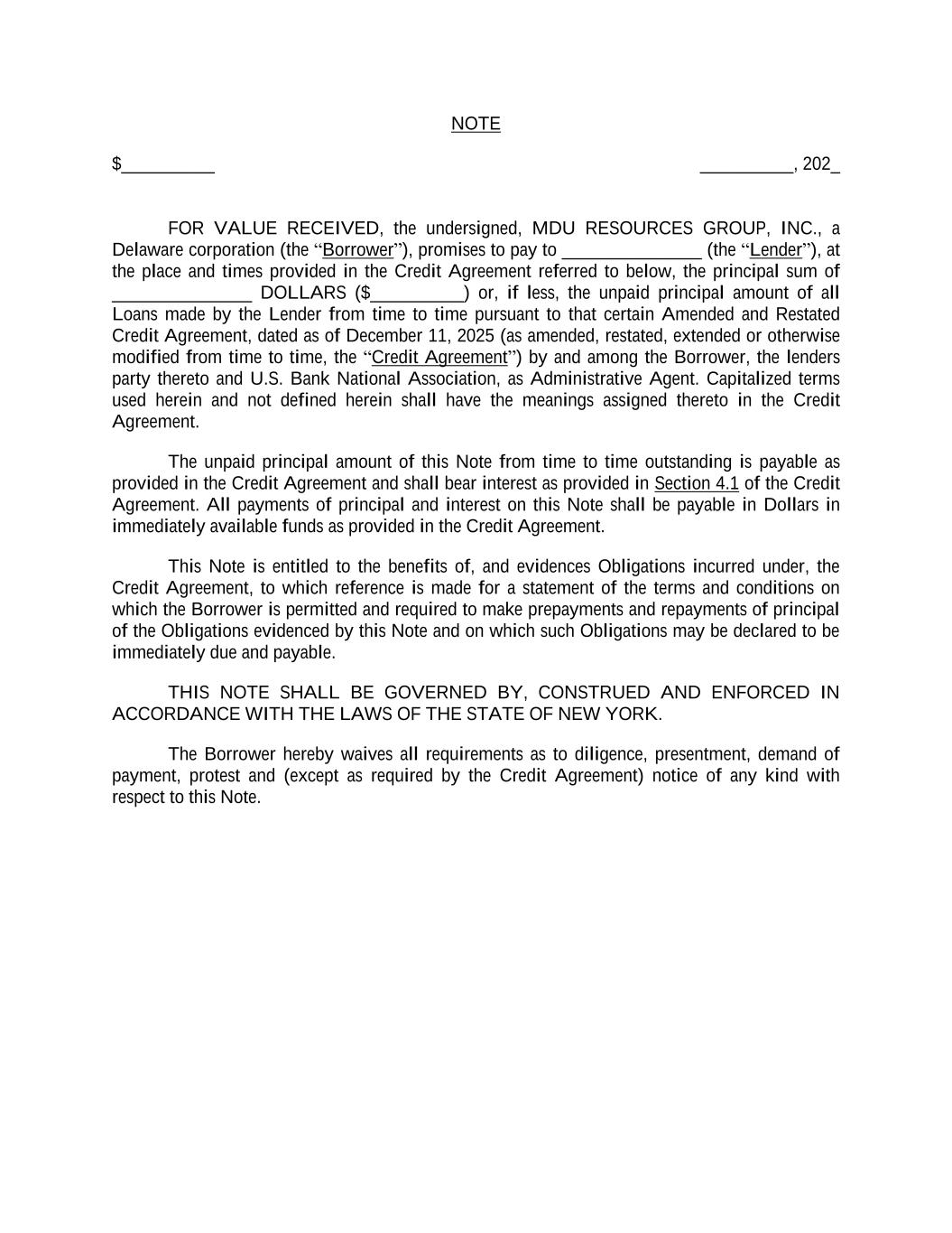 NOTE $__________ __________, 202_ FOR VALUE RECEIVED, the undersigned, MDU RESOURCES GROUP, INC., a Delaware corporation (the “Borrower”), promises to pay to _______________ (the “Lender”), at the place and times provided in the Credit Agreement referred to below, the principal sum of _______________ DOLLARS ($__________) or, if less, the unpaid principal amount of all Loans made by the Lender from time to time pursuant to that certain Amended and Restated Credit Agreement, dated as of December 11, 2025 (as amended, restated, extended or otherwise modified from time to time, the “Credit Agreement”) by and among the Borrower, the lenders party thereto and U.S. Bank National Association, as Administrative Agent. Capitalized terms used herein and not defined herein shall have the meanings assigned thereto in the Credit Agreement. The unpaid principal amount of this Note from time to time outstanding is payable as provided in the Credit Agreement and shall bear interest as provided in Section 4.1 of the Credit Agreement. All payments of principal and interest on this Note shall be payable in Dollars in immediately available funds as provided in the Credit Agreement. This Note is entitled to the benefits of, and evidences Obligations incurred under, the Credit Agreement, to which reference is made for a statement of the terms and conditions on which the Borrower is permitted and required to make prepayments and repayments of principal of the Obligations evidenced by this Note and on which such Obligations may be declared to be immediately due and payable. THIS NOTE SHALL BE GOVERNED BY, CONSTRUED AND ENFORCED IN ACCORDANCE WITH THE LAWS OF THE STATE OF NEW YORK. The Borrower hereby waives all requirements as to diligence, presentment, demand of payment, protest and (except as required by the Credit Agreement) notice of any kind with respect to this Note.