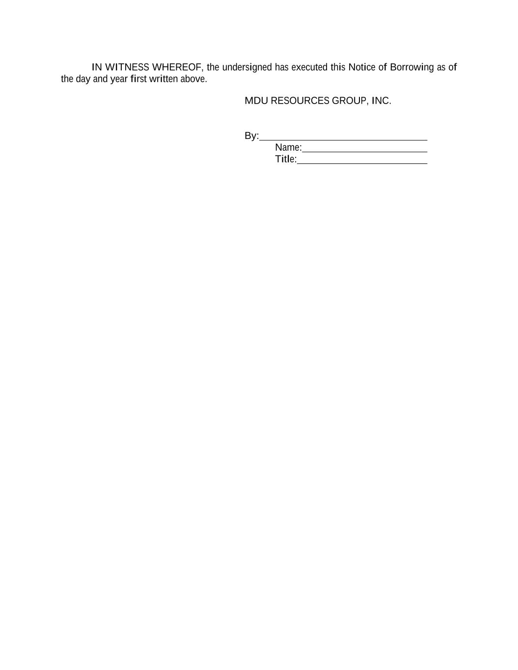 IN WITNESS WHEREOF, the undersigned has executed this Notice of Borrowing as of the day and year first written above. MDU RESOURCES GROUP, INC. By: Name: Title: