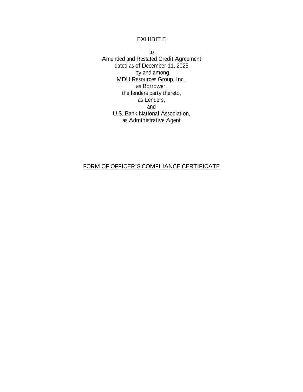 EXHIBIT E to Amended and Restated Credit Agreement dated as of December 11, 2025 by and among MDU Resources Group, Inc., as Borrower, the lenders party thereto, as Lenders, and U.S. Bank National Association, as Administrative Agent FORM OF OFFICER’S COMPLIANCE CERTIFICATE
