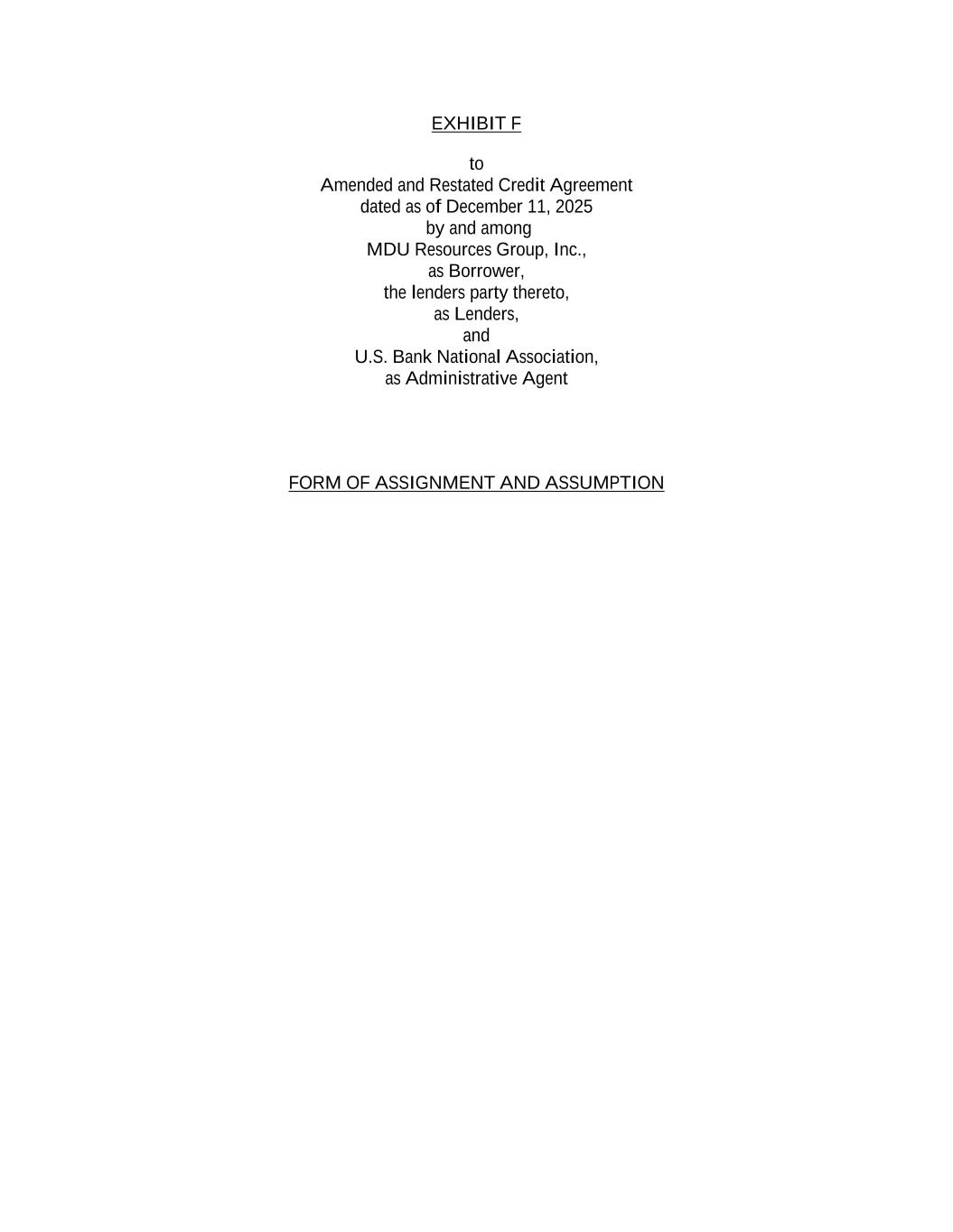 EXHIBIT F to Amended and Restated Credit Agreement dated as of December 11, 2025 by and among MDU Resources Group, Inc., as Borrower, the lenders party thereto, as Lenders, and U.S. Bank National Association, as Administrative Agent FORM OF ASSIGNMENT AND ASSUMPTION