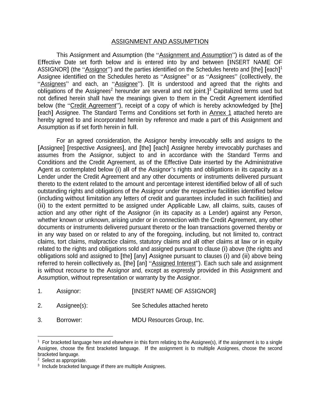 ASSIGNMENT AND ASSUMPTION This Assignment and Assumption (the “Assignment and Assumption”) is dated as of the Effective Date set forth below and is entered into by and between [INSERT NAME OF ASSIGNOR] (the “Assignor”) and the parties identified on the Schedules hereto and [the] [each]1 Assignee identified on the Schedules hereto as “Assignee” or as “Assignees” (collectively, the “Assignees” and each, an “Assignee”). [It is understood and agreed that the rights and obligations of the Assignees2 hereunder are several and not joint.]3 Capitalized terms used but not defined herein shall have the meanings given to them in the Credit Agreement identified below (the “Credit Agreement”), receipt of a copy of which is hereby acknowledged by [the] [each] Assignee. The Standard Terms and Conditions set forth in Annex 1 attached hereto are hereby agreed to and incorporated herein by reference and made a part of this Assignment and Assumption as if set forth herein in full. For an agreed consideration, the Assignor hereby irrevocably sells and assigns to the [Assignee] [respective Assignees], and [the] [each] Assignee hereby irrevocably purchases and assumes from the Assignor, subject to and in accordance with the Standard Terms and Conditions and the Credit Agreement, as of the Effective Date inserted by the Administrative Agent as contemplated below (i) all of the Assignor’s rights and obligations in its capacity as a Lender under the Credit Agreement and any other documents or instruments delivered pursuant thereto to the extent related to the amount and percentage interest identified below of all of such outstanding rights and obligations of the Assignor under the respective facilities identified below (including without limitation any letters of credit and guarantees included in such facilities) and (ii) to the extent permitted to be assigned under Applicable Law, all claims, suits, causes of action and any other right of the Assignor (in its capacity as a Lender) against any Person, whether known or unknown, arising under or in connection with the Credit Agreement, any other documents or instruments delivered pursuant thereto or the loan transactions governed thereby or in any way based on or related to any of the foregoing, including, but not limited to, contract claims, tort claims, malpractice claims, statutory claims and all other claims at law or in equity related to the rights and obligations sold and assigned pursuant to clause (i) above (the rights and obligations sold and assigned to [the] [any] Assignee pursuant to clauses (i) and (ii) above being referred to herein collectively as, [the] [an] “Assigned Interest”). Each such sale and assignment is without recourse to the Assignor and, except as expressly provided in this Assignment and Assumption, without representation or warranty by the Assignor. 1. Assignor: [INSERT NAME OF ASSIGNOR] 2. Assignee(s): See Schedules attached hereto 3. Borrower: MDU Resources Group, Inc. 1 For bracketed language here and elsewhere in this form relating to the Assignee(s), if the assignment is to a single Assignee, choose the first bracketed language. If the assignment is to multiple Assignees, choose the second bracketed language. 2 Select as appropriate. 3 Include bracketed language if there are multiple Assignees.