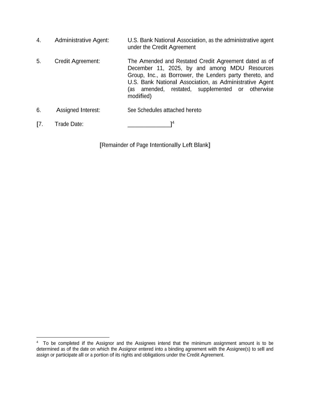 4. Administrative Agent: U.S. Bank National Association, as the administrative agent under the Credit Agreement 5. Credit Agreement: The Amended and Restated Credit Agreement dated as of December 11, 2025, by and among MDU Resources Group, Inc., as Borrower, the Lenders party thereto, and U.S. Bank National Association, as Administrative Agent (as amended, restated, supplemented or otherwise modified) 6. Assigned Interest: See Schedules attached hereto [7. Trade Date: ______________]4 [Remainder of Page Intentionally Left Blank] 4 To be completed if the Assignor and the Assignees intend that the minimum assignment amount is to be determined as of the date on which the Assignor entered into a binding agreement with the Assignee(s) to sell and assign or participate all or a portion of its rights and obligations under the Credit Agreement.