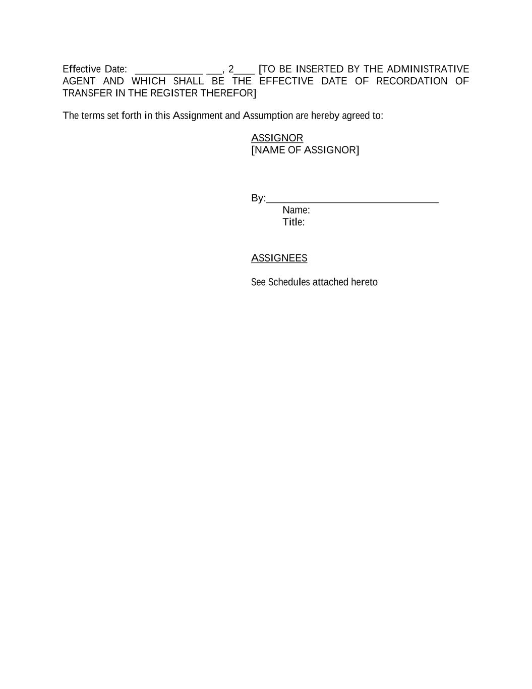Effective Date: _____________ ___, 2____ [TO BE INSERTED BY THE ADMINISTRATIVE AGENT AND WHICH SHALL BE THE EFFECTIVE DATE OF RECORDATION OF TRANSFER IN THE REGISTER THEREFOR] The terms set forth in this Assignment and Assumption are hereby agreed to: ASSIGNOR [NAME OF ASSIGNOR] By: Name: Title: ASSIGNEES See Schedules attached hereto