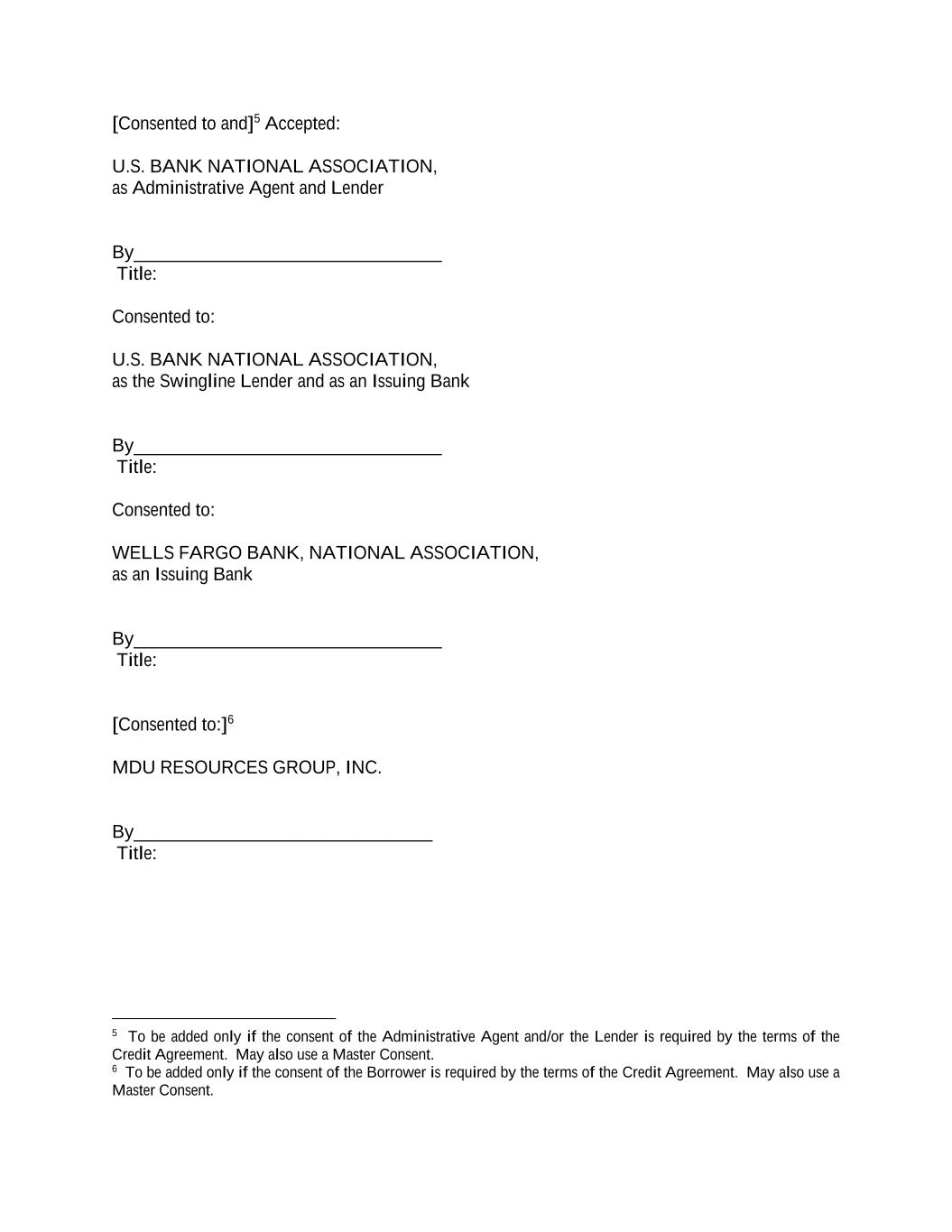 [Consented to and]5 Accepted: U.S. BANK NATIONAL ASSOCIATION, as Administrative Agent and Lender By_________________________________ Title: Consented to: U.S. BANK NATIONAL ASSOCIATION, as the Swingline Lender and as an Issuing Bank By_________________________________ Title: Consented to: WELLS FARGO BANK, NATIONAL ASSOCIATION, as an Issuing Bank By_________________________________ Title: [Consented to:]6 MDU RESOURCES GROUP, INC. By________________________________ Title: 5 To be added only if the consent of the Administrative Agent and/or the Lender is required by the terms of the Credit Agreement. May also use a Master Consent. 6 To be added only if the consent of the Borrower is required by the terms of the Credit Agreement. May also use a Master Consent.