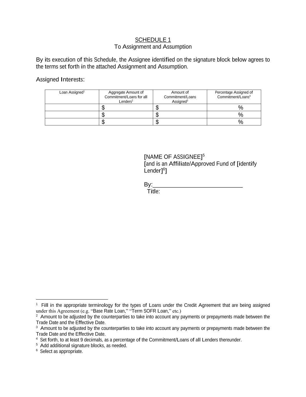 SCHEDULE 1 To Assignment and Assumption By its execution of this Schedule, the Assignee identified on the signature block below agrees to the terms set forth in the attached Assignment and Assumption. Assigned Interests: Loan Assigned1 Aggregate Amount of Commitment/Loans for all Lenders2 Amount of Commitment/Loans Assigned3 Percentage Assigned of Commitment/Loans4 $ $ % $ $ % $ $ % [NAME OF ASSIGNEE]5 [and is an Affiliate/Approved Fund of [identify Lender]6] By:______________________________ Title: 1 Fill in the appropriate terminology for the types of Loans under the Credit Agreement that are being assigned under this Agreement (e.g. “Base Rate Loan,” “Term SOFR Loan,” etc.) 2 Amount to be adjusted by the counterparties to take into account any payments or prepayments made between the Trade Date and the Effective Date. 3 Amount to be adjusted by the counterparties to take into account any payments or prepayments made between the Trade Date and the Effective Date. 4 Set forth, to at least 9 decimals, as a percentage of the Commitment/Loans of all Lenders thereunder. 5 Add additional signature blocks, as needed. 6 Select as appropriate.