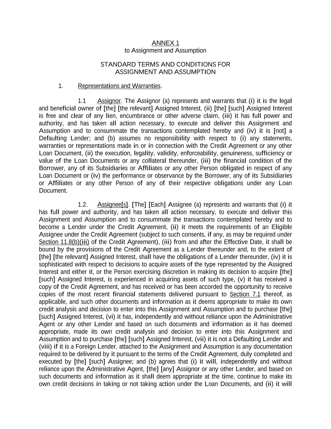 ANNEX 1 to Assignment and Assumption STANDARD TERMS AND CONDITIONS FOR ASSIGNMENT AND ASSUMPTION 1. Representations and Warranties. 1.1 Assignor. The Assignor (a) represents and warrants that (i) it is the legal and beneficial owner of [the] [the relevant] Assigned Interest, (ii) [the] [such] Assigned Interest is free and clear of any lien, encumbrance or other adverse claim, (iii) it has full power and authority, and has taken all action necessary, to execute and deliver this Assignment and Assumption and to consummate the transactions contemplated hereby and (iv) it is [not] a Defaulting Lender; and (b) assumes no responsibility with respect to (i) any statements, warranties or representations made in or in connection with the Credit Agreement or any other Loan Document, (ii) the execution, legality, validity, enforceability, genuineness, sufficiency or value of the Loan Documents or any collateral thereunder, (iii) the financial condition of the Borrower, any of its Subsidiaries or Affiliates or any other Person obligated in respect of any Loan Document or (iv) the performance or observance by the Borrower, any of its Subsidiaries or Affiliates or any other Person of any of their respective obligations under any Loan Document. 1.2. Assignee[s]. [The] [Each] Assignee (a) represents and warrants that (i) it has full power and authority, and has taken all action necessary, to execute and deliver this Assignment and Assumption and to consummate the transactions contemplated hereby and to become a Lender under the Credit Agreement, (ii) it meets the requirements of an Eligible Assignee under the Credit Agreement (subject to such consents, if any, as may be required under Section 11.8(b)(iii) of the Credit Agreement), (iii) from and after the Effective Date, it shall be bound by the provisions of the Credit Agreement as a Lender thereunder and, to the extent of [the] [the relevant] Assigned Interest, shall have the obligations of a Lender thereunder, (iv) it is sophisticated with respect to decisions to acquire assets of the type represented by the Assigned Interest and either it, or the Person exercising discretion in making its decision to acquire [the] [such] Assigned Interest, is experienced in acquiring assets of such type, (v) it has received a copy of the Credit Agreement, and has received or has been accorded the opportunity to receive copies of the most recent financial statements delivered pursuant to Section 7.1 thereof, as applicable, and such other documents and information as it deems appropriate to make its own credit analysis and decision to enter into this Assignment and Assumption and to purchase [the] [such] Assigned Interest, (vi) it has, independently and without reliance upon the Administrative Agent or any other Lender and based on such documents and information as it has deemed appropriate, made its own credit analysis and decision to enter into this Assignment and Assumption and to purchase [the] [such] Assigned Interest, (vii) it is not a Defaulting Lender and (viii) if it is a Foreign Lender, attached to the Assignment and Assumption is any documentation required to be delivered by it pursuant to the terms of the Credit Agreement, duly completed and executed by [the] [such] Assignee; and (b) agrees that (i) it will, independently and without reliance upon the Administrative Agent, [the] [any] Assignor or any other Lender, and based on such documents and information as it shall deem appropriate at the time, continue to make its own credit decisions in taking or not taking action under the Loan Documents, and (ii) it will