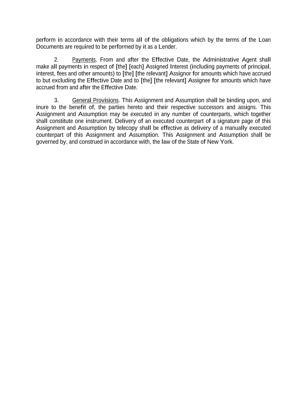 perform in accordance with their terms all of the obligations which by the terms of the Loan Documents are required to be performed by it as a Lender. 2. Payments. From and after the Effective Date, the Administrative Agent shall make all payments in respect of [the] [each] Assigned Interest (including payments of principal, interest, fees and other amounts) to [the] [the relevant] Assignor for amounts which have accrued to but excluding the Effective Date and to [the] [the relevant] Assignee for amounts which have accrued from and after the Effective Date. 3. General Provisions. This Assignment and Assumption shall be binding upon, and inure to the benefit of, the parties hereto and their respective successors and assigns. This Assignment and Assumption may be executed in any number of counterparts, which together shall constitute one instrument. Delivery of an executed counterpart of a signature page of this Assignment and Assumption by telecopy shall be effective as delivery of a manually executed counterpart of this Assignment and Assumption. This Assignment and Assumption shall be governed by, and construed in accordance with, the law of the State of New York.