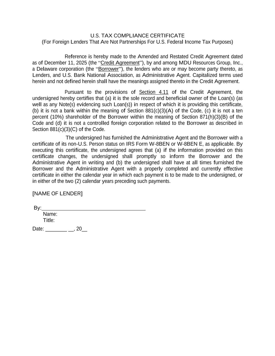 U.S. TAX COMPLIANCE CERTIFICATE (For Foreign Lenders That Are Not Partnerships For U.S. Federal Income Tax Purposes) Reference is hereby made to the Amended and Restated Credit Agreement dated as of December 11, 2025 (the “Credit Agreement”), by and among MDU Resources Group, Inc., a Delaware corporation (the “Borrower”), the lenders who are or may become party thereto, as Lenders, and U.S. Bank National Association, as Administrative Agent. Capitalized terms used herein and not defined herein shall have the meanings assigned thereto in the Credit Agreement. Pursuant to the provisions of Section 4.11 of the Credit Agreement, the undersigned hereby certifies that (a) it is the sole record and beneficial owner of the Loan(s) (as well as any Note(s) evidencing such Loan(s)) in respect of which it is providing this certificate, (b) it is not a bank within the meaning of Section 881(c)(3)(A) of the Code, (c) it is not a ten percent (10%) shareholder of the Borrower within the meaning of Section 871(h)(3)(B) of the Code and (d) it is not a controlled foreign corporation related to the Borrower as described in Section 881(c)(3)(C) of the Code. The undersigned has furnished the Administrative Agent and the Borrower with a certificate of its non-U.S. Person status on IRS Form W-8BEN or W-8BEN E, as applicable. By executing this certificate, the undersigned agrees that (a) if the information provided on this certificate changes, the undersigned shall promptly so inform the Borrower and the Administrative Agent in writing and (b) the undersigned shall have at all times furnished the Borrower and the Administrative Agent with a properly completed and currently effective certificate in either the calendar year in which each payment is to be made to the undersigned, or in either of the two (2) calendar years preceding such payments. [NAME OF LENDER] By: Name: Title: Date: ________ __, 20__