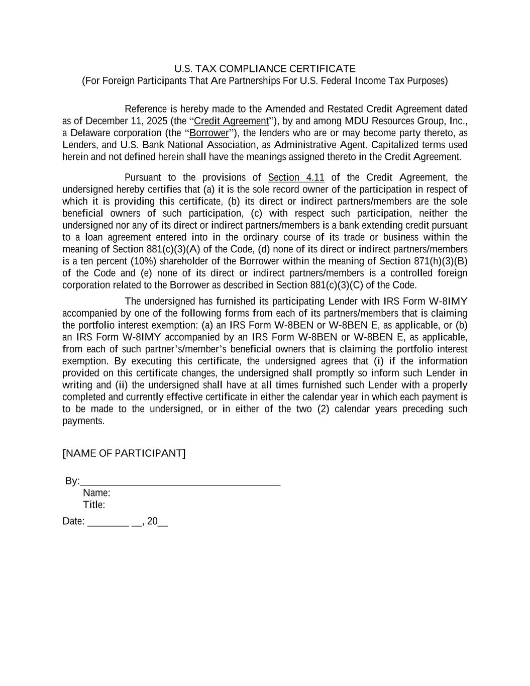 U.S. TAX COMPLIANCE CERTIFICATE (For Foreign Participants That Are Partnerships For U.S. Federal Income Tax Purposes) Reference is hereby made to the Amended and Restated Credit Agreement dated as of December 11, 2025 (the “Credit Agreement”), by and among MDU Resources Group, Inc., a Delaware corporation (the “Borrower”), the lenders who are or may become party thereto, as Lenders, and U.S. Bank National Association, as Administrative Agent. Capitalized terms used herein and not defined herein shall have the meanings assigned thereto in the Credit Agreement. Pursuant to the provisions of Section 4.11 of the Credit Agreement, the undersigned hereby certifies that (a) it is the sole record owner of the participation in respect of which it is providing this certificate, (b) its direct or indirect partners/members are the sole beneficial owners of such participation, (c) with respect such participation, neither the undersigned nor any of its direct or indirect partners/members is a bank extending credit pursuant to a loan agreement entered into in the ordinary course of its trade or business within the meaning of Section 881(c)(3)(A) of the Code, (d) none of its direct or indirect partners/members is a ten percent (10%) shareholder of the Borrower within the meaning of Section 871(h)(3)(B) of the Code and (e) none of its direct or indirect partners/members is a controlled foreign corporation related to the Borrower as described in Section 881(c)(3)(C) of the Code. The undersigned has furnished its participating Lender with IRS Form W-8IMY accompanied by one of the following forms from each of its partners/members that is claiming the portfolio interest exemption: (a) an IRS Form W-8BEN or W-8BEN E, as applicable, or (b) an IRS Form W-8IMY accompanied by an IRS Form W-8BEN or W-8BEN E, as applicable, from each of such partner’s/member’s beneficial owners that is claiming the portfolio interest exemption. By executing this certificate, the undersigned agrees that (i) if the information provided on this certificate changes, the undersigned shall promptly so inform such Lender in writing and (ii) the undersigned shall have at all times furnished such Lender with a properly completed and currently effective certificate in either the calendar year in which each payment is to be made to the undersigned, or in either of the two (2) calendar years preceding such payments. [NAME OF PARTICIPANT] By: Name: Title: Date: ________ __, 20__