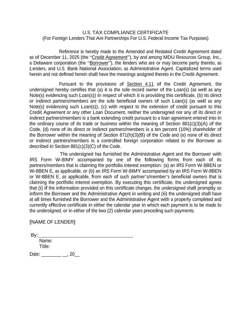 U.S. TAX COMPLIANCE CERTIFICATE (For Foreign Lenders That Are Partnerships For U.S. Federal Income Tax Purposes) Reference is hereby made to the Amended and Restated Credit Agreement dated as of December 11, 2025 (the “Credit Agreement”), by and among MDU Resources Group, Inc., a Delaware corporation (the “Borrower”), the lenders who are or may become party thereto, as Lenders, and U.S. Bank National Association, as Administrative Agent. Capitalized terms used herein and not defined herein shall have the meanings assigned thereto in the Credit Agreement. Pursuant to the provisions of Section 4.11 of the Credit Agreement, the undersigned hereby certifies that (a) it is the sole record owner of the Loan(s) (as well as any Note(s) evidencing such Loan(s)) in respect of which it is providing this certificate, (b) its direct or indirect partners/members are the sole beneficial owners of such Loan(s) (as well as any Note(s) evidencing such Loan(s)), (c) with respect to the extension of credit pursuant to this Credit Agreement or any other Loan Document, neither the undersigned nor any of its direct or indirect partners/members is a bank extending credit pursuant to a loan agreement entered into in the ordinary course of its trade or business within the meaning of Section 881(c)(3)(A) of the Code, (d) none of its direct or indirect partners/members is a ten percent (10%) shareholder of the Borrower within the meaning of Section 871(h)(3)(B) of the Code and (e) none of its direct or indirect partners/members is a controlled foreign corporation related to the Borrower as described in Section 881(c)(3)(C) of the Code. The undersigned has furnished the Administrative Agent and the Borrower with IRS Form W-8IMY accompanied by one of the following forms from each of its partners/members that is claiming the portfolio interest exemption: (a) an IRS Form W-8BEN or W-8BEN E, as applicable, or (b) an IRS Form W-8IMY accompanied by an IRS Form W-8BEN or W-8BEN E, as applicable, from each of such partner’s/member’s beneficial owners that is claiming the portfolio interest exemption. By executing this certificate, the undersigned agrees that (i) if the information provided on this certificate changes, the undersigned shall promptly so inform the Borrower and the Administrative Agent in writing and (ii) the undersigned shall have at all times furnished the Borrower and the Administrative Agent with a properly completed and currently effective certificate in either the calendar year in which each payment is to be made to the undersigned, or in either of the two (2) calendar years preceding such payments. [NAME OF LENDER] By: Name: Title: Date: ________ __, 20__