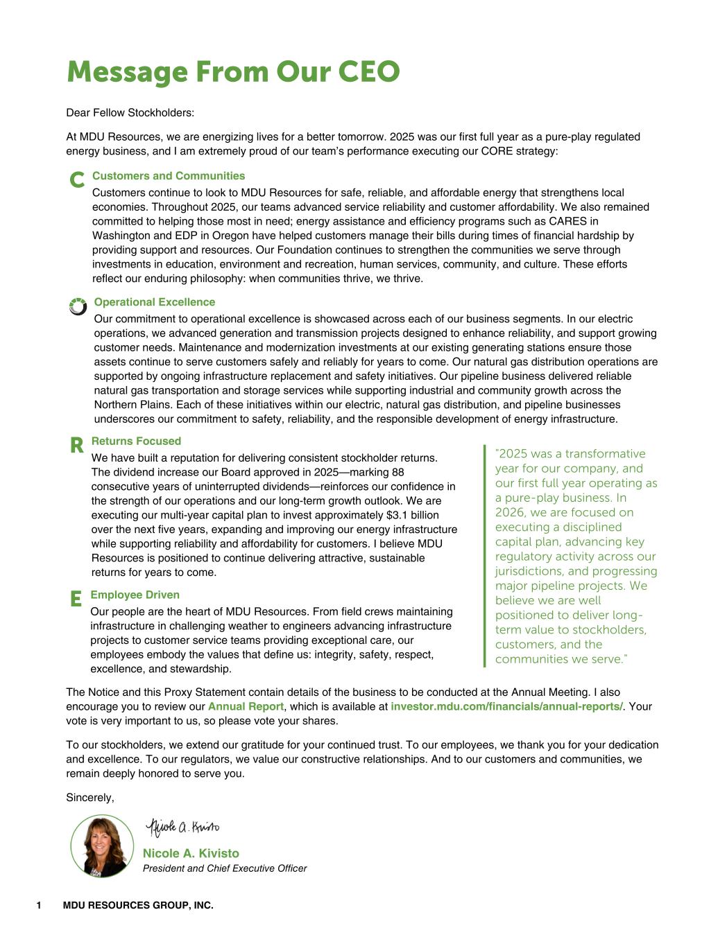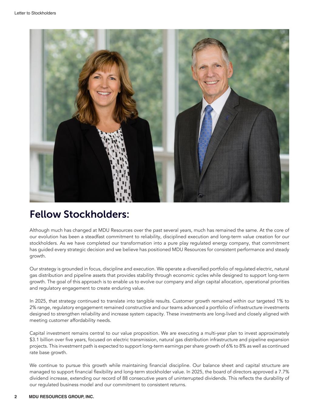 Fellow Stockholders: Although much has changed at MDU Resources over the past several years, much has remained the same. At the core of our evolution has been a steadfast commitment to reliability, disciplined execution and long-term value creation for our stockholders. As we have completed our transformation into a pure play regulated energy company, that commitment has guided every strategic decision and we believe has positioned MDU Resources for consistent performance and steady growth. Our strategy is grounded in focus, discipline and execution. We operate a diversified portfolio of regulated electric, natural gas distribution and pipeline assets that provides stability through economic cycles while designed to support long‑term growth. The goal of this approach is to enable us to evolve our company and align capital allocation, operational priorities and regulatory engagement to create enduring value. In 2025, that strategy continued to translate into tangible results. Customer growth remained within our targeted 1% to 2% range, regulatory engagement remained constructive and our teams advanced a portfolio of infrastructure investments designed to strengthen reliability and increase system capacity. These investments are long‑lived and closely aligned with meeting customer affordability needs. Capital investment remains central to our value proposition. We are executing a multi‑year plan to invest approximately $3.1 billion over five years, focused on electric transmission, natural gas distribution infrastructure and pipeline expansion projects. This investment path is expected to support long-term earnings per share growth of 6% to 8% as well as continued rate base growth. We continue to pursue this growth while maintaining financial discipline. Our balance sheet and capital structure are managed to support financial flexibility and long‑term stockholder value. In 2025, the board of directors approved a 7.7% dividend increase, extending our record of 88 consecutive years of uninterrupted dividends. This reflects the durability of our regulated business model and our commitment to consistent returns. Letter to Stockholders MDU RESOURCES GROUP, INC.2