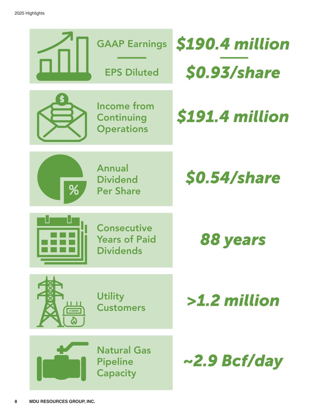 Our pipeline segment continues to benefit from a disciplined, customer‑driven growth model. The Minot Expansion Project was placed into service in November 2025, increasing natural gas transportation capacity by approximately seven million cubic feet per day. We also continue to make progress on required surveys for the Line Section 32 Expansion Project and anticipate filing a FERC application in early 2026. This project is designed to increase transportation capacity by approximately 190 million cubic feet per day to support a new electric generation facility in northwest North Dakota. Construction is targeted to be complete in late 2028. Our pipeline segment also continues to advance the Minot Industrial Project. This proposed project could consist of an approximately 90-mile pipeline from Tioga, North Dakota to Minot, North Dakota and ancillary facilities to support anticipated industrial demand in the area. The company has signed an agreement to support the early-stage development of the project through the second quarter of 2026. In addition, we continue to make progress on the proposed Bakken East Pipeline Project, which could consist of approximately 350 miles of pipeline from the Bakken region to eastern North Dakota, along with additional laterals. In 2025, the North Dakota Industrial Commission selected the project for firm capacity commitments of up to $50 million annually for a ten‑year period, reinforcing the strength of underlying demand. The FERC pre-filing request was submitted Dec. 23, 2025, and the company concluded a binding open season in the first quarter of 2026. Negotiations continue with precedent agreements and letters of intent with several interested parties. These projects reflect our ability to deliver reliable natural gas transportation and storage services while supporting industrial and community growth across the Northern Plains. Each of these initiatives underscores our commitment to safety, reliability and the responsible development of energy infrastructure. Operational excellence isn’t just a collection of metrics, it’s ingrained in who we are and how we perform as a company. Returns That Endure For nearly eight decades as a publicly-traded company, MDU Resources has built a reputation for delivering consistent stockholder returns. Our 2025 performance once again demonstrated this strength. Our growth model, supported by a disciplined capital investment program and constructive regulatory environment, continues to generate reliable cash flow and strong earnings performance. We maintained a healthy balance sheet throughout the year that provides the flexibility to fund growth while continuing to return value to stockholders. Letter to Stockholders MDU RESOURCES GROUP, INC.4