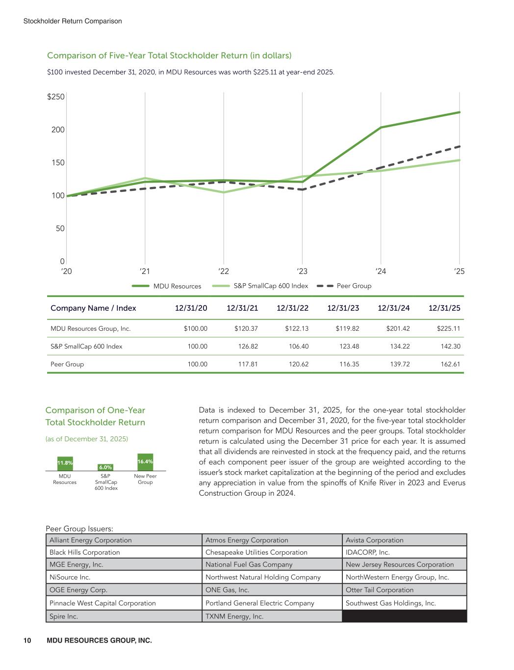 Alliant Energy Corporation Atmos Energy Corporation Avista Corporation Black Hills Corporation Chesapeake Utilities Corporation IDACORP, Inc. MGE Energy, Inc. National Fuel Gas Company New Jersey Resources Corporation NiSource Inc. Northwest Natural Holding Company NorthWestern Energy Group, Inc. OGE Energy Corp. ONE Gas, Inc. Otter Tail Corporation Pinnacle West Capital Corporation Portland General Electric Company Southwest Gas Holdings, Inc. Spire Inc. TXNM Energy, Inc. Stockholder Return Comparison MDU RESOURCES GROUP, INC.10 Data is indexed to December 31, 2025, for the one-year total stockholder return comparison and December 31, 2020, for the five-year total stockholder return comparison for MDU Resources and the peer groups. Total stockholder return is calculated using the December 31 price for each year. It is assumed that all dividends are reinvested in stock at the frequency paid, and the returns of each component peer issuer of the group are weighted according to the issuer’s stock market capitalization at the beginning of the period and excludes any appreciation in value from the spinoffs of Knife River in 2023 and Everus Construction Group in 2024. MDU Resources S&P SmallCap 600 Index New Peer Group 11.8% 6.0% 16.4% 43% Comparison of One-Year Total Stockholder Return (as of December 31, 2025) Comparison of Five-Year Total Stockholder Return (in dollars) $100 invested December 31, 2020, in MDU Resources was worth $225.11 at year-end 2025. S&P SmallCap 600 IndexMDU Resources Peer Group 0 50 100 150 200 $250 ’24 ’25’23’22’21’20 Company Name / Index 12/31/20 12/31/21 12/31/22 12/31/23 12/31/24 12/31/25 MDU Resources Group, Inc. $100.00 $120.37 $122.13 $119.82 $201.42 $225.11 S&P SmallCap 600 Index 100.00 126.82 106.40 123.48 134.22 142.30 Peer Group 100.00 117.81 120.62 116.35 139.72 162.61 Peer Group Issuers:
