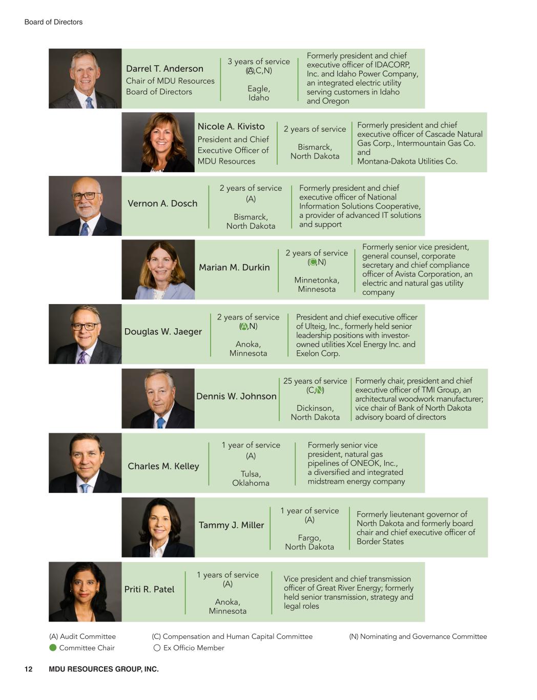 Darrel T. Anderson Chair of the Board Independent Director Age: 68 Director Since: 2023 Committees(1) Relevant Skills Professional Experience IDACORP, Inc. (NYSE: IDA) and Idaho Power Company (regulated electric utility company) • President and Chief Executive Officer, May 2014 through May 2020 Other Board Service • Board Chair, Gemstone Holdings (parent company of Blue Cross of Idaho, a non-profit mutual insurance company), since January 2024 • Board Chair, Blue Cross of Idaho, since May 2023, and a director since 2019 • Director, IDACORP, Inc. and Idaho Power Company, September 2013 through May 2022 Reasons for Nomination Mr. Anderson has nearly 30 years of experience in the regulated energy industry within our service territory, and has served in several leadership positions, including CEO of IDACORP, that provide him with relevant expertise to serve as Chair of the Board. In particular, he brings extensive public company operational, financial, and leadership experience. He also contributes significant knowledge of local, state, and regional issues involving Idaho, a state that represents a significant–and growing–share of the Company’s operations. Further, he brings deep compensation and management resources, and public company governance, knowledge from his experience serving as CEO of a public company to his service as a member of the Compensation Committee and the Governance Committee, respectively. (1) The Board has appointed Mr. Anderson as Governance Committee Chair, effective following the Annual Meeting. Nicole A. Kivisto President and Chief Executive Officer Age: 52 Director Since: 2024 Relevant Skills Professional Experience MDU Resources Group, Inc. (NYSE: MDU) • President and Chief Executive Officer, since January 2024 • President and Chief Executive Officer, Montana-Dakota Utilities Co., Cascade Natural Gas Corporation, and Intermountain Gas Company, January 2015 through January 2024 Other Board Service • Director, AGA (trade association for natural gas industry), since 2015 • Director, EEI (trade association for electric industry), since 2015 • Director, Bravera Bank (employee and director owned bank), since February 2018 • Director, North Dakota Lignite Energy Council (trade association for coal industry), 2015 through 2023 • Member, Board of Trustees, University of Mary, 2017 through 2023 Reasons for Nomination Ms. Kivisto brings to our Board over 30 years of regulated energy experience. Over the past three decades, she has held several operational, financial, and leadership positions within the Company, leading to her current role as CEO. She brings deep knowledge of our Company and its business operations, and contributes valuable insight into management’s views and perspectives, to the Board. Proposal 1: Election of Directors 17 MDU RESOURCES GROUP, INC.