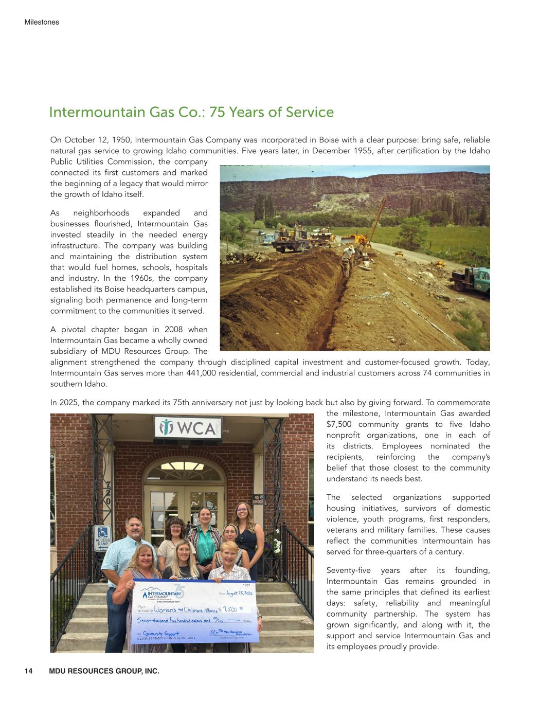 Milestones MDU RESOURCES GROUP, INC.14 On October 12, 1950, Intermountain Gas Company was incorporated in Boise with a clear purpose: bring safe, reliable natural gas service to growing Idaho communities. Five years later, in December 1955, after certification by the Idaho Public Utilities Commission, the company connected its first customers and marked the beginning of a legacy that would mirror the growth of Idaho itself. As neighborhoods expanded and businesses flourished, Intermountain Gas invested steadily in the needed energy infrastructure. The company was building and maintaining the distribution system that would fuel homes, schools, hospitals and industry. In the 1960s, the company established its Boise headquarters campus, signaling both permanence and long-term commitment to the communities it served. A pivotal chapter began in 2008 when Intermountain Gas became a wholly owned subsidiary of MDU Resources Group. The alignment strengthened the company through disciplined capital investment and customer-focused growth. Today, Intermountain Gas serves more than 441,000 residential, commercial and industrial customers across 74 communities in southern Idaho. In 2025, the company marked its 75th anniversary not just by looking back but also by giving forward. To commemorate the milestone, Intermountain Gas awarded $7,500 community grants to five Idaho nonprofit organizations, one in each of its districts. Employees nominated the recipients, reinforcing the company’s belief that those closest to the community understand its needs best. The selected organizations supported housing initiatives, survivors of domestic violence, youth programs, first responders, veterans and military families. These causes reflect the communities Intermountain has served for three-quarters of a century. Seventy-five years after its founding, Intermountain Gas remains grounded in the same principles that defined its earliest days: safety, reliability and meaningful community partnership. The system has grown significantly, and along with it, the support and service Intermountain Gas and its employees proudly provide. Intermountain Gas Co.: 75 Years of Service