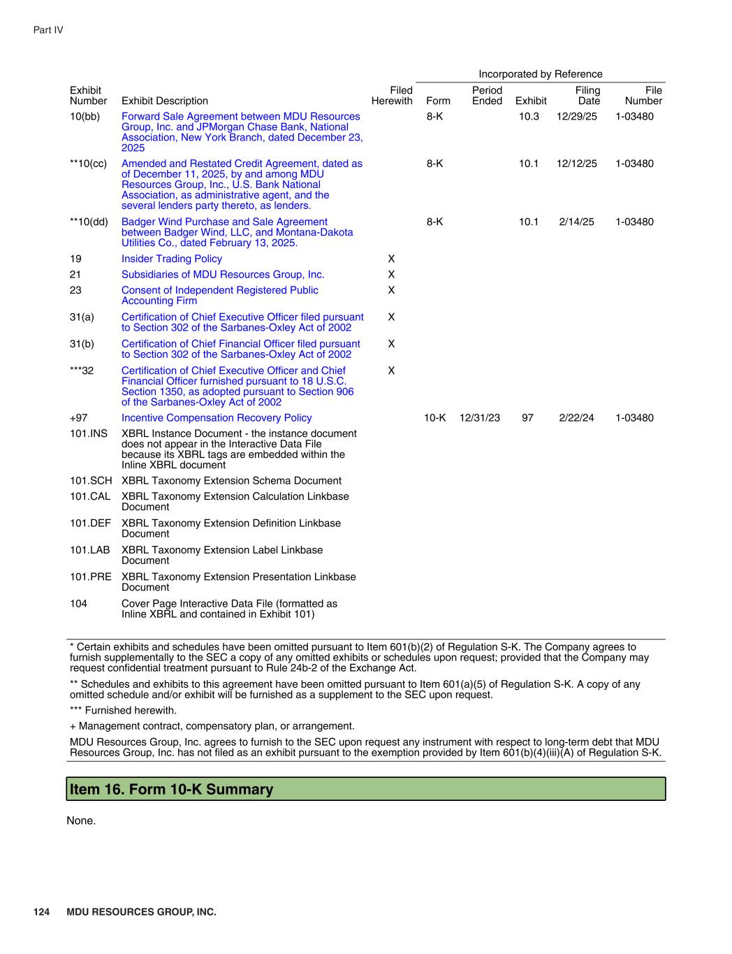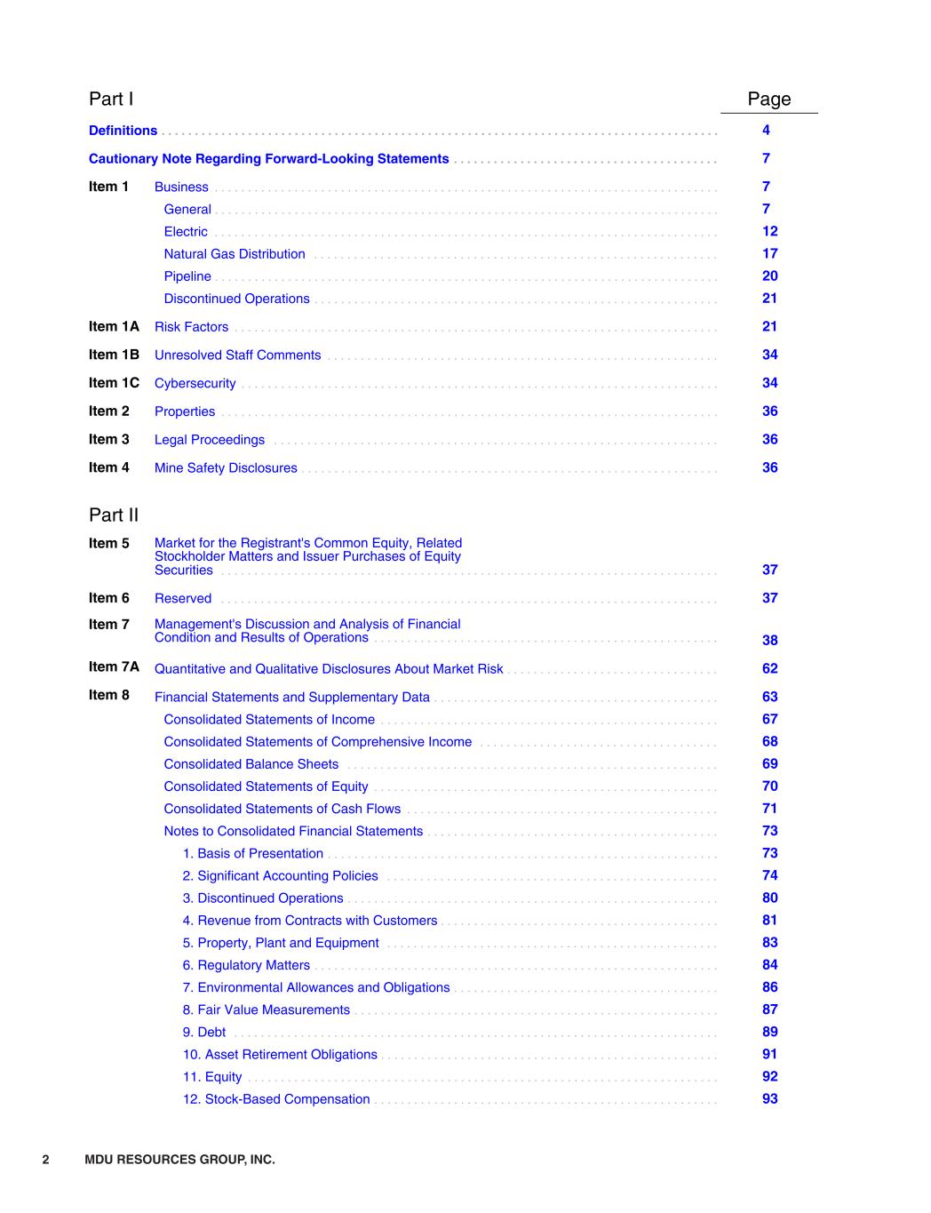 MDU RESOURCES GROUP, INC.2 Part I Page Definitions . . . . . . . . . . . . . . . . . . . . . . . . . . . . . . . . . . . . . . . . . . . . . . . . . . . . . . . . . . . . . . . . . . . . . . . . . . . . . . . . . . . . 4 Cautionary Note Regarding Forward-Looking Statements . . . . . . . . . . . . . . . . . . . . . . . . . . . . . . . . . . . . . . . . 7 Item 1 Business . . . . . . . . . . . . . . . . . . . . . . . . . . . . . . . . . . . . . . . . . . . . . . . . . . . . . . . . . . . . . . . . . . . . . . . . . . . . 7 General . . . . . . . . . . . . . . . . . . . . . . . . . . . . . . . . . . . . . . . . . . . . . . . . . . . . . . . . . . . . . . . . . . . . . . . . . . . . 7 Electric . . . . . . . . . . . . . . . . . . . . . . . . . . . . . . . . . . . . . . . . . . . . . . . . . . . . . . . . . . . . . . . . . . . . . . . . . . . . 12 Natural Gas Distribution . . . . . . . . . . . . . . . . . . . . . . . . . . . . . . . . . . . . . . . . . . . . . . . . . . . . . . . . . . . . . 17 Pipeline . . . . . . . . . . . . . . . . . . . . . . . . . . . . . . . . . . . . . . . . . . . . . . . . . . . . . . . . . . . . . . . . . . . . . . . . . . . . 20 Discontinued Operations . . . . . . . . . . . . . . . . . . . . . . . . . . . . . . . . . . . . . . . . . . . . . . . . . . . . . . . . . . . . . 21 Item 1A Risk Factors . . . . . . . . . . . . . . . . . . . . . . . . . . . . . . . . . . . . . . . . . . . . . . . . . . . . . . . . . . . . . . . . . . . . . . . . . 21 Item 1B Unresolved Staff Comments . . . . . . . . . . . . . . . . . . . . . . . . . . . . . . . . . . . . . . . . . . . . . . . . . . . . . . . . . . . 34 Item 1C Cybersecurity . . . . . . . . . . . . . . . . . . . . . . . . . . . . . . . . . . . . . . . . . . . . . . . . . . . . . . . . . . . . . . . . . . . . . . . . 34 Item 2 Properties . . . . . . . . . . . . . . . . . . . . . . . . . . . . . . . . . . . . . . . . . . . . . . . . . . . . . . . . . . . . . . . . . . . . . . . . . . . 36 Item 3 Legal Proceedings . . . . . . . . . . . . . . . . . . . . . . . . . . . . . . . . . . . . . . . . . . . . . . . . . . . . . . . . . . . . . . . . . . . 36 Item 4 Mine Safety Disclosures . . . . . . . . . . . . . . . . . . . . . . . . . . . . . . . . . . . . . . . . . . . . . . . . . . . . . . . . . . . . . . . 36 Part II Item 5 Market for the Registrant's Common Equity, Related Stockholder Matters and Issuer Purchases of Equity Securities . . . . . . . . . . . . . . . . . . . . . . . . . . . . . . . . . . . . . . . . . . . . . . . . . . . . . . . . . . . . . . . . . . . . . . . . . . . 37 Item 6 Reserved . . . . . . . . . . . . . . . . . . . . . . . . . . . . . . . . . . . . . . . . . . . . . . . . . . . . . . . . . . . . . . . . . . . . . . . . . . . 37 Item 7 Management's Discussion and Analysis of Financial Condition and Results of Operations . . . . . . . . . . . . . . . . . . . . . . . . . . . . . . . . . . . . . . . . . . . . . . . . . . . . 38 Item 7A Quantitative and Qualitative Disclosures About Market Risk . . . . . . . . . . . . . . . . . . . . . . . . . . . . . . . . 62 Item 8 Financial Statements and Supplementary Data . . . . . . . . . . . . . . . . . . . . . . . . . . . . . . . . . . . . . . . . . . . 63 Consolidated Statements of Income . . . . . . . . . . . . . . . . . . . . . . . . . . . . . . . . . . . . . . . . . . . . . . . . . . . 67 Consolidated Statements of Comprehensive Income . . . . . . . . . . . . . . . . . . . . . . . . . . . . . . . . . . . . 68 Consolidated Balance Sheets . . . . . . . . . . . . . . . . . . . . . . . . . . . . . . . . . . . . . . . . . . . . . . . . . . . . . . . . 69 Consolidated Statements of Equity . . . . . . . . . . . . . . . . . . . . . . . . . . . . . . . . . . . . . . . . . . . . . . . . . . . . 70 Consolidated Statements of Cash Flows . . . . . . . . . . . . . . . . . . . . . . . . . . . . . . . . . . . . . . . . . . . . . . . 71 Notes to Consolidated Financial Statements . . . . . . . . . . . . . . . . . . . . . . . . . . . . . . . . . . . . . . . . . . . . 73 1. Basis of Presentation . . . . . . . . . . . . . . . . . . . . . . . . . . . . . . . . . . . . . . . . . . . . . . . . . . . . . . . . . . . 73 2. Significant Accounting Policies . . . . . . . . . . . . . . . . . . . . . . . . . . . . . . . . . . . . . . . . . . . . . . . . . . 74 3. Discontinued Operations . . . . . . . . . . . . . . . . . . . . . . . . . . . . . . . . . . . . . . . . . . . . . . . . . . . . . . . . 80 4. Revenue from Contracts with Customers . . . . . . . . . . . . . . . . . . . . . . . . . . . . . . . . . . . . . . . . . . 81 5. Property, Plant and Equipment . . . . . . . . . . . . . . . . . . . . . . . . . . . . . . . . . . . . . . . . . . . . . . . . . . 83 6. Regulatory Matters . . . . . . . . . . . . . . . . . . . . . . . . . . . . . . . . . . . . . . . . . . . . . . . . . . . . . . . . . . . . . 84 7. Environmental Allowances and Obligations . . . . . . . . . . . . . . . . . . . . . . . . . . . . . . . . . . . . . . . . 86 8. Fair Value Measurements . . . . . . . . . . . . . . . . . . . . . . . . . . . . . . . . . . . . . . . . . . . . . . . . . . . . . . . 87 9. Debt . . . . . . . . . . . . . . . . . . . . . . . . . . . . . . . . . . . . . . . . . . . . . . . . . . . . . . . . . . . . . . . . . . . . . . . . . 89 10. Asset Retirement Obligations . . . . . . . . . . . . . . . . . . . . . . . . . . . . . . . . . . . . . . . . . . . . . . . . . . . 91 11. Equity . . . . . . . . . . . . . . . . . . . . . . . . . . . . . . . . . . . . . . . . . . . . . . . . . . . . . . . . . . . . . . . . . . . . . . . 92 12. Stock-Based Compensation . . . . . . . . . . . . . . . . . . . . . . . . . . . . . . . . . . . . . . . . . . . . . . . . . . . . 93 Contents 2 MDU Resources Group, Inc. Form 10-K
