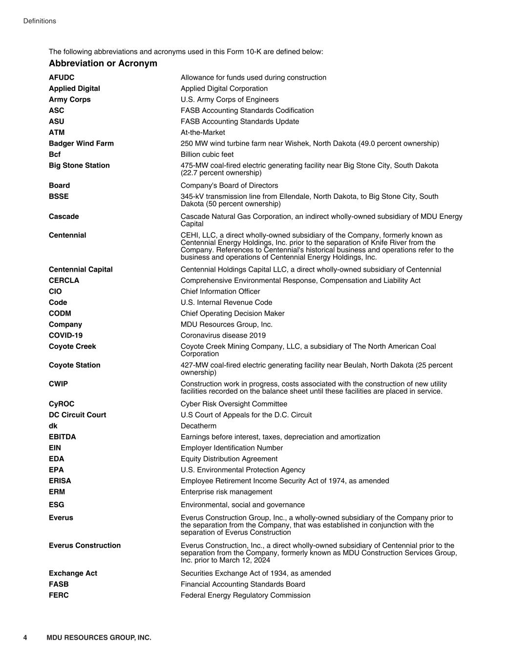 MDU RESOURCES GROUP, INC.4 Definitions The following abbreviations and acronyms used in this Form 10-K are defined below: Abbreviation or Acronym AFUDC Allowance for funds used during construction Applied Digital Applied Digital Corporation Army Corps U.S. Army Corps of Engineers ASC FASB Accounting Standards Codification ASU FASB Accounting Standards Update ATM At-the-Market Badger Wind Farm 250 MW wind turbine farm near Wishek, North Dakota (49.0 percent ownership) Bcf Billion cubic feet Big Stone Station 475-MW coal-fired electric generating facility near Big Stone City, South Dakota (22.7 percent ownership) Board Company's Board of Directors BSSE 345-kV transmission line from Ellendale, North Dakota, to Big Stone City, South Dakota (50 percent ownership) Cascade Cascade Natural Gas Corporation, an indirect wholly-owned subsidiary of MDU Energy Capital Centennial CEHI, LLC, a direct wholly-owned subsidiary of the Company, formerly known as Centennial Energy Holdings, Inc. prior to the separation of Knife River from the Company. References to Centennial's historical business and operations refer to the business and operations of Centennial Energy Holdings, Inc. Centennial Capital Centennial Holdings Capital LLC, a direct wholly-owned subsidiary of Centennial CERCLA Comprehensive Environmental Response, Compensation and Liability Act CIO Chief Information Officer Code U.S. Internal Revenue Code CODM Chief Operating Decision Maker Company MDU Resources Group, Inc. COVID-19 Coronavirus disease 2019 Coyote Creek Coyote Creek Mining Company, LLC, a subsidiary of The North American Coal Corporation Coyote Station 427-MW coal-fired electric generating facility near Beulah, North Dakota (25 percent ownership) CWIP Construction work in progress, costs associated with the construction of new utility facilities recorded on the balance sheet until these facilities are placed in service. CyROC Cyber Risk Oversight Committee DC Circuit Court U.S Court of Appeals for the D.C. Circuit dk Decatherm EBITDA Earnings before interest, taxes, depreciation and amortization EIN Employer Identification Number EDA Equity Distribution Agreement EPA U.S. Environmental Protection Agency ERISA Employee Retirement Income Security Act of 1974, as amended ERM Enterprise risk management ESG Environmental, social and governance Everus Everus Construction Group, Inc., a wholly-owned subsidiary of the Company prior to the separation from the Company, that was established in conjunction with the separation of Everus Construction Everus Construction Everus Construction, Inc., a direct wholly-owned subsidiary of Centennial prior to the separation from the Company, formerly known as MDU Construction Services Group, Inc. prior to March 12, 2024 Exchange Act Securities Exchange Act of 1934, as amended FASB Financial Accounting Standards Board FERC Federal Energy Regulatory Commission Definitions 4 MDU Resources Group, Inc. Form 10-K