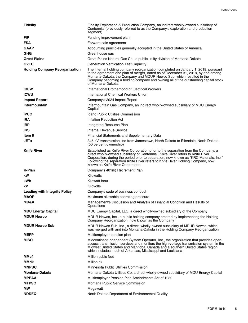 5FORM 10-K Definitions Fidelity Fidelity Exploration & Production Company, an indirect wholly-owned subsidiary of Centennial (previously referred to as the Company's exploration and production segment) FIP Funding improvement plan FSA Forward sale agreement GAAP Accounting principles generally accepted in the United States of America GHG Greenhouse gas Great Plains Great Plains Natural Gas Co., a public utility division of Montana-Dakota GVTC Generation Verification Test Capacity Holding Company Reorganization The internal holding company reorganization completed on January 1, 2019, pursuant to the agreement and plan of merger, dated as of December 31, 2018, by and among Montana-Dakota, the Company and MDUR Newco Sub, which resulted in the Company becoming a holding company and owning all of the outstanding capital stock of Montana-Dakota. IBEW International Brotherhood of Electrical Workers ICWU International Chemical Workers Union Impact Report Company's 2024 Impact Report Intermountain Intermountain Gas Company, an indirect wholly-owned subsidiary of MDU Energy Capital IPUC Idaho Public Utilities Commission IRA Inflation Reduction Act IRP Integrated Resource Plan IRS Internal Revenue Service Item 8 Financial Statements and Supplementary Data JETx 345-kV transmission line from Jamestown, North Dakota to Ellendale, North Dakota (50 percent ownership) Knife River Established as Knife River Corporation prior to the separation from the Company, a direct wholly-owned subsidiary of Centennial. Knife River refers to Knife River Corporation, during the period prior to separation, now known as "KRC Materials, Inc." Following the separation Knife River refers to Knife River Holding Company, now known as Knife River Corporation. K-Plan Company's 401(k) Retirement Plan kW Kilowatts kWh Kilowatt-hour kV Kilovolts Leading with Integrity Policy Company's code of business conduct MAOP Maximum allowable operating pressure MD&A Management's Discussion and Analysis of Financial Condition and Results of Operations MDU Energy Capital MDU Energy Capital, LLC, a direct wholly-owned subsidiary of the Company MDUR Newco MDUR Newco, Inc., a public holding company created by implementing the Holding Company Reorganization, now known as the Company MDUR Newco Sub MDUR Newco Sub, Inc., a direct, wholly-owned subsidiary of MDUR Newco, which was merged with and into Montana-Dakota in the Holding Company Reorganization MEPP Multiemployer pension plan MISO Midcontinent Independent System Operator, Inc., the organization that provides open- access transmission services and monitors the high-voltage transmission system in the Midwest United States and Manitoba, Canada and a southern United States region which includes much of Arkansas, Mississippi and Louisiana MMcf Million cubic feet MMdk Million dk MNPUC Minnesota Public Utilities Commission Montana-Dakota Montana-Dakota Utilities Co. a direct wholly-owned subsidiary of MDU Energy Capital MPPAA Multiemployer Pension Plan Amendments Act of 1980 MTPSC Montana Public Service Commission MW Megawatt NDDEQ North Dakota Department of Environmental Quality Definitions MDU Resources Group, Inc. Form 10-K 5