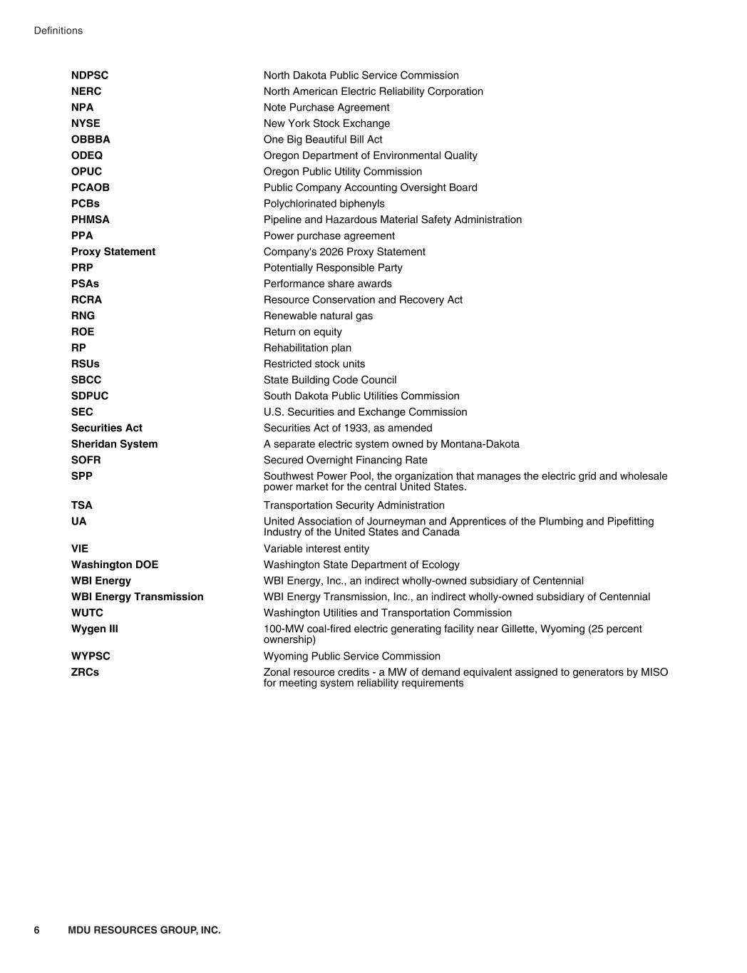 MDU RESOURCES GROUP, INC.6 Definitions NDPSC North Dakota Public Service Commission NERC North American Electric Reliability Corporation NPA Note Purchase Agreement NYSE New York Stock Exchange OBBBA One Big Beautiful Bill Act ODEQ Oregon Department of Environmental Quality OPUC Oregon Public Utility Commission PCAOB Public Company Accounting Oversight Board PCBs Polychlorinated biphenyls PHMSA Pipeline and Hazardous Material Safety Administration PPA Power purchase agreement Proxy Statement Company's 2026 Proxy Statement PRP Potentially Responsible Party PSAs Performance share awards RCRA Resource Conservation and Recovery Act RNG Renewable natural gas ROE Return on equity RP Rehabilitation plan RSUs Restricted stock units SBCC State Building Code Council SDPUC South Dakota Public Utilities Commission SEC U.S. Securities and Exchange Commission Securities Act Securities Act of 1933, as amended Sheridan System A separate electric system owned by Montana-Dakota SOFR Secured Overnight Financing Rate SPP Southwest Power Pool, the organization that manages the electric grid and wholesale power market for the central United States. TSA Transportation Security Administration UA United Association of Journeyman and Apprentices of the Plumbing and Pipefitting Industry of the United States and Canada VIE Variable interest entity Washington DOE Washington State Department of Ecology WBI Energy WBI Energy, Inc., an indirect wholly-owned subsidiary of Centennial WBI Energy Transmission WBI Energy Transmission, Inc., an indirect wholly-owned subsidiary of Centennial WUTC Washington Utilities and Transportation Commission Wygen III 100-MW coal-fired electric generating facility near Gillette, Wyoming (25 percent ownership) WYPSC Wyoming Public Service Commission ZRCs Zonal resource credits - a MW of demand equivalent assigned to generators by MISO for meeting system reliability requirements Definitions 6 MDU Resources Group, Inc. Form 10-K