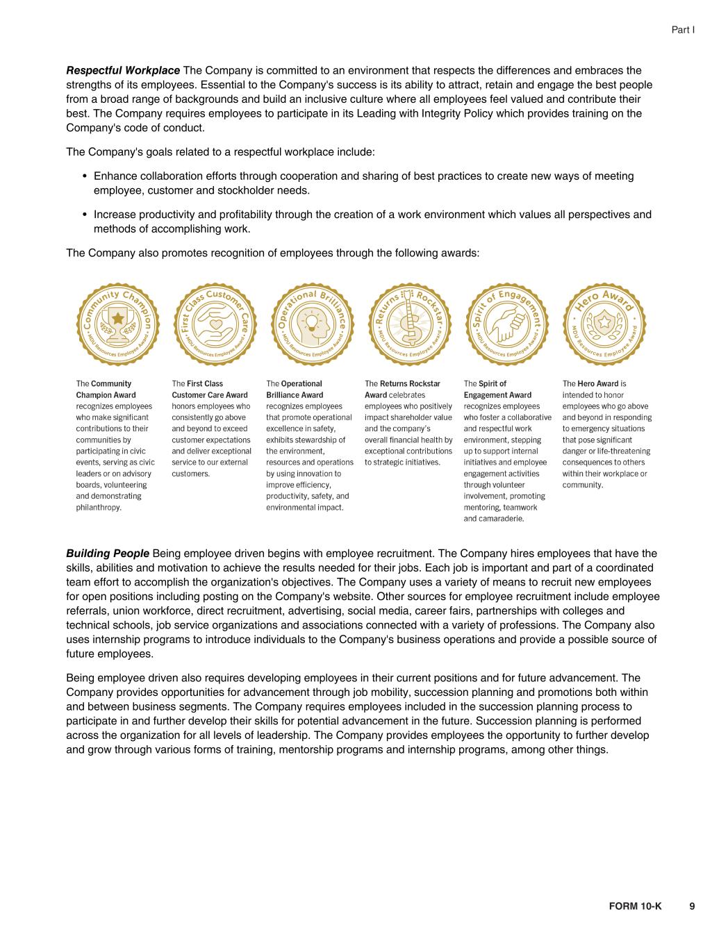 9 Part I FORM 10-K Respectful Workplace The Company is committed to an environment that respects the differences and embraces the strengths of its employees. Essential to the Company's success is its ability to attract, retain and engage the best people from a broad range of backgrounds and build an inclusive culture where all employees feel valued and contribute their best. The Company requires employees to participate in its Leading with Integrity Policy which provides training on the Company's code of conduct. The Company's goals related to a respectful workplace include: • Enhance collaboration efforts through cooperation and sharing of best practices to create new ways of meeting employee, customer and stockholder needs. • Increase productivity and profitability through the creation of a work environment which values all perspectives and methods of accomplishing work. The Company also promotes recognition of employees through the following awards: Building People Being employee driven begins with employee recruitment. The Company hires employees that have the skills, abilities and motivation to achieve the results needed for their jobs. Each job is important and part of a coordinated team effort to accomplish the organization's objectives. The Company uses a variety of means to recruit new employees for open positions including posting on the Company's website. Other sources for employee recruitment include employee referrals, union workforce, direct recruitment, advertising, social media, career fairs, partnerships with colleges and technical schools, job service organizations and associations connected with a variety of professions. The Company also uses internship programs to introduce individuals to the Company's business operations and provide a possible source of future employees. Being employee driven also requires developing employees in their current positions and for future advancement. The Company provides opportunities for advancement through job mobility, succession planning and promotions both within and between business segments. The Company requires employees included in the succession planning process to participate in and further develop their skills for potential advancement in the future. Succession planning is performed across the organization for all levels of leadership. The Company provides employees the opportunity to further develop and grow through various forms of training, mentorship programs and internship programs, among other things. Index Part I MDU Resources Group, Inc. Form 10-K 9