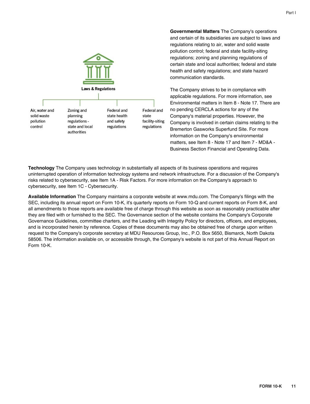 11 Part I FORM 10-K Governmental Matters The Company's operations and certain of its subsidiaries are subject to laws and regulations relating to air, water and solid waste pollution control; federal and state facility-siting regulations; zoning and planning regulations of certain state and local authorities; federal and state health and safety regulations; and state hazard communication standards. The Company strives to be in compliance with applicable regulations. For more information, see Environmental matters in Item 8 - Note 17. There are no pending CERCLA actions for any of the Company's material properties. However, the Company is involved in certain claims relating to the Bremerton Gasworks Superfund Site. For more information on the Company's environmental matters, see Item 8 - Note 17 and Item 7 - MD&A - Business Section Financial and Operating Data. Technology The Company uses technology in substantially all aspects of its business operations and requires uninterrupted operation of information technology systems and network infrastructure. For a discussion of the Company's risks related to cybersecurity, see Item 1A - Risk Factors. For more information on the Company's approach to cybersecurity, see Item 1C - Cybersecurity. Available Information The Company maintains a corporate website at www.mdu.com. The Company's filings with the SEC, including its annual report on Form 10-K, it's quarterly reports on Form 10-Q and current reports on Form 8-K, and all amendments to those reports are available free of charge through this website as soon as reasonably practicable after they are filed with or furnished to the SEC. The Governance section of the website contains the Company's Corporate Governance Guidelines, committee charters, and the Leading with Integrity Policy for directors, officers, and employees, and is incorporated herein by reference. Copies of these documents may also be obtained free of charge upon written request to the Company's corporate secretary at MDU Resources Group, Inc., P.O. Box 5650, Bismarck, North Dakota 58506. The information available on, or accessible through, the Company's website is not part of this Annual Report on Form 10-K. Index Part I MDU Resources Group, Inc. Form 10-K 11