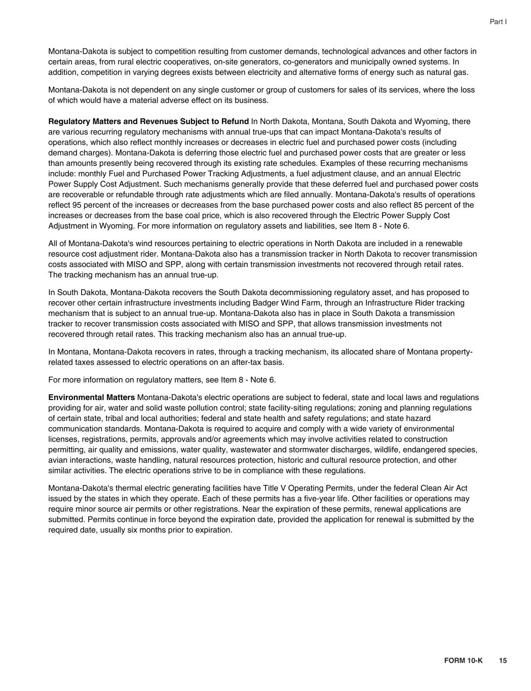 15 Part I FORM 10-K Montana-Dakota is subject to competition resulting from customer demands, technological advances and other factors in certain areas, from rural electric cooperatives, on-site generators, co-generators and municipally owned systems. In addition, competition in varying degrees exists between electricity and alternative forms of energy such as natural gas. Montana-Dakota is not dependent on any single customer or group of customers for sales of its services, where the loss of which would have a material adverse effect on its business. Regulatory Matters and Revenues Subject to Refund In North Dakota, Montana, South Dakota and Wyoming, there are various recurring regulatory mechanisms with annual true-ups that can impact Montana-Dakota's results of operations, which also reflect monthly increases or decreases in electric fuel and purchased power costs (including demand charges). Montana-Dakota is deferring those electric fuel and purchased power costs that are greater or less than amounts presently being recovered through its existing rate schedules. Examples of these recurring mechanisms include: monthly Fuel and Purchased Power Tracking Adjustments, a fuel adjustment clause, and an annual Electric Power Supply Cost Adjustment. Such mechanisms generally provide that these deferred fuel and purchased power costs are recoverable or refundable through rate adjustments which are filed annually. Montana-Dakota's results of operations reflect 95 percent of the increases or decreases from the base purchased power costs and also reflect 85 percent of the increases or decreases from the base coal price, which is also recovered through the Electric Power Supply Cost Adjustment in Wyoming. For more information on regulatory assets and liabilities, see Item 8 - Note 6. All of Montana-Dakota's wind resources pertaining to electric operations in North Dakota are included in a renewable resource cost adjustment rider. Montana-Dakota also has a transmission tracker in North Dakota to recover transmission costs associated with MISO and SPP, along with certain transmission investments not recovered through retail rates. The tracking mechanism has an annual true-up. In South Dakota, Montana-Dakota recovers the South Dakota decommissioning regulatory asset, and has proposed to recover other certain infrastructure investments including Badger Wind Farm, through an Infrastructure Rider tracking mechanism that is subject to an annual true-up. Montana-Dakota also has in place in South Dakota a transmission tracker to recover transmission costs associated with MISO and SPP, that allows transmission investments not recovered through retail rates. This tracking mechanism also has an annual true-up. In Montana, Montana-Dakota recovers in rates, through a tracking mechanism, its allocated share of Montana property- related taxes assessed to electric operations on an after-tax basis. For more information on regulatory matters, see Item 8 - Note 6. Environmental Matters Montana-Dakota's electric operations are subject to federal, state and local laws and regulations providing for air, water and solid waste pollution control; state facility-siting regulations; zoning and planning regulations of certain state, tribal and local authorities; federal and state health and safety regulations; and state hazard communication standards. Montana-Dakota is required to acquire and comply with a wide variety of environmental licenses, registrations, permits, approvals and/or agreements which may involve activities related to construction permitting, air quality and emissions, water quality, wastewater and stormwater discharges, wildlife, endangered species, avian interactions, waste handling, natural resources protection, historic and cultural resource protection, and other similar activities. The electric operations strive to be in compliance with these regulations. Montana-Dakota's thermal electric generating facilities have Title V Operating Permits, under the federal Clean Air Act issued by the states in which they operate. Each of these permits has a five-year life. Other facilities or operations may require minor source air permits or other registrations. Near the expiration of these permits, renewal applications are submitted. Permits continue in force beyond the expiration date, provided the application for renewal is submitted by the required date, usually six months prior to expiration. Index Part I MDU Resources Group, Inc. Form 10-K 15