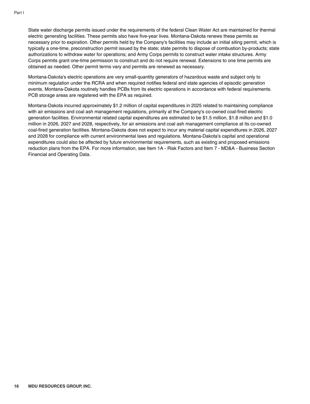 MDU RESOURCES GROUP, INC. Part I 16 State water discharge permits issued under the requirements of the federal Clean Water Act are maintained for thermal electric generating facilities. These permits also have five-year lives. Montana-Dakota renews these permits as necessary prior to expiration. Other permits held by the Company's facilities may include an initial siting permit, which is typically a one-time, preconstruction permit issued by the state; state permits to dispose of combustion by-products; state authorizations to withdraw water for operations; and Army Corps permits to construct water intake structures. Army Corps permits grant one-time permission to construct and do not require renewal. Extensions to one time permits are obtained as needed. Other permit terms vary and permits are renewed as necessary. Montana-Dakota's electric operations are very small-quantity generators of hazardous waste and subject only to minimum regulation under the RCRA and when required notifies federal and state agencies of episodic generation events. Montana-Dakota routinely handles PCBs from its electric operations in accordance with federal requirements. PCB storage areas are registered with the EPA as required. Montana-Dakota incurred approximately $1.2 million of capital expenditures in 2025 related to maintaining compliance with air emissions and coal ash management regulations, primarily at the Company's co-owned coal-fired electric generation facilities. Environmental related capital expenditures are estimated to be $1.5 million, $1.8 million and $1.0 million in 2026, 2027 and 2028, respectively, for air emissions and coal ash management compliance at its co-owned coal-fired generation facilities. Montana-Dakota does not expect to incur any material capital expenditures in 2026, 2027 and 2028 for compliance with current environmental laws and regulations. Montana-Dakota's capital and operational expenditures could also be affected by future environmental requirements, such as existing and proposed emissions reduction plans from the EPA. For more information, see Item 1A - Risk Factors and Item 7 - MD&A - Business Section Financial and Operating Data. Index Part I 16 MDU Resources Group, Inc. Form 10-K