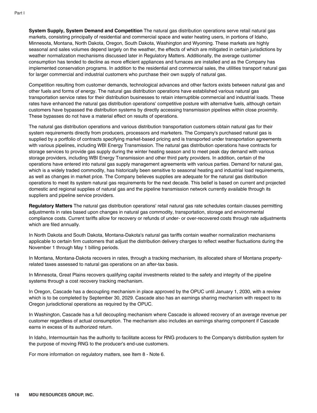 MDU RESOURCES GROUP, INC. Part I 18 System Supply, System Demand and Competition The natural gas distribution operations serve retail natural gas markets, consisting principally of residential and commercial space and water heating users, in portions of Idaho, Minnesota, Montana, North Dakota, Oregon, South Dakota, Washington and Wyoming. These markets are highly seasonal and sales volumes depend largely on the weather, the effects of which are mitigated in certain jurisdictions by weather normalization mechanisms discussed later in Regulatory Matters. Additionally, the average customer consumption has tended to decline as more efficient appliances and furnaces are installed and as the Company has implemented conservation programs. In addition to the residential and commercial sales, the utilities transport natural gas for larger commercial and industrial customers who purchase their own supply of natural gas. Competition resulting from customer demands, technological advances and other factors exists between natural gas and other fuels and forms of energy. The natural gas distribution operations have established various natural gas transportation service rates for their distribution businesses to retain interruptible commercial and industrial loads. These rates have enhanced the natural gas distribution operations' competitive posture with alternative fuels, although certain customers have bypassed the distribution systems by directly accessing transmission pipelines within close proximity. These bypasses do not have a material effect on results of operations. The natural gas distribution operations and various distribution transportation customers obtain natural gas for their system requirements directly from producers, processors and marketers. The Company's purchased natural gas is supplied by a portfolio of contracts specifying market-based pricing and is transported under transportation agreements with various pipelines, including WBI Energy Transmission. The natural gas distribution operations have contracts for storage services to provide gas supply during the winter heating season and to meet peak day demand with various storage providers, including WBI Energy Transmission and other third party providers. In addition, certain of the operations have entered into natural gas supply management agreements with various parties. Demand for natural gas, which is a widely traded commodity, has historically been sensitive to seasonal heating and industrial load requirements, as well as changes in market price. The Company believes supplies are adequate for the natural gas distribution operations to meet its system natural gas requirements for the next decade. This belief is based on current and projected domestic and regional supplies of natural gas and the pipeline transmission network currently available through its suppliers and pipeline service providers. Regulatory Matters The natural gas distribution operations' retail natural gas rate schedules contain clauses permitting adjustments in rates based upon changes in natural gas commodity, transportation, storage and environmental compliance costs. Current tariffs allow for recovery or refunds of under- or over-recovered costs through rate adjustments which are filed annually. In North Dakota and South Dakota, Montana-Dakota's natural gas tariffs contain weather normalization mechanisms applicable to certain firm customers that adjust the distribution delivery charges to reflect weather fluctuations during the November 1 through May 1 billing periods. In Montana, Montana-Dakota recovers in rates, through a tracking mechanism, its allocated share of Montana property- related taxes assessed to natural gas operations on an after-tax basis. In Minnesota, Great Plains recovers qualifying capital investments related to the safety and integrity of the pipeline systems through a cost recovery tracking mechanism. In Oregon, Cascade has a decoupling mechanism in place approved by the OPUC until January 1, 2030, with a review which is to be completed by September 30, 2029. Cascade also has an earnings sharing mechanism with respect to its Oregon jurisdictional operations as required by the OPUC. In Washington, Cascade has a full decoupling mechanism where Cascade is allowed recovery of an average revenue per customer regardless of actual consumption. The mechanism also includes an earnings sharing component if Cascade earns in excess of its authorized return. In Idaho, Intermountain has the authority to facilitate access for RNG producers to the Company's distribution system for the purpose of moving RNG to the producer's end-use customers. For more information on regulatory matters, see Item 8 - Note 6. Index Part I 18 MDU Resources Group, Inc. Form 10-K