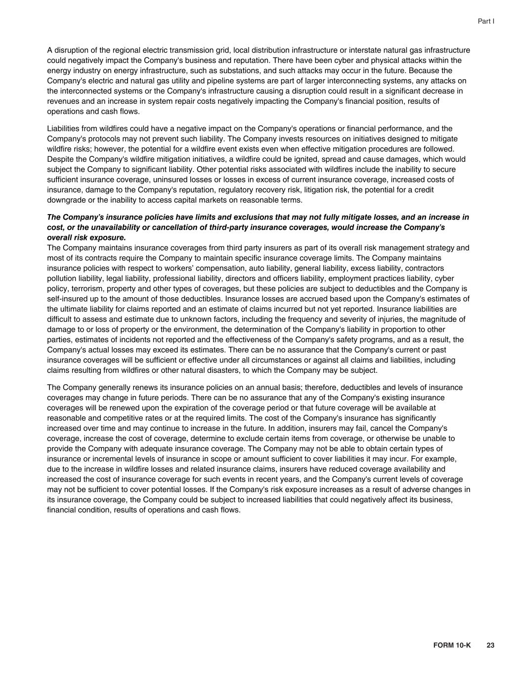 23 Part I FORM 10-K A disruption of the regional electric transmission grid, local distribution infrastructure or interstate natural gas infrastructure could negatively impact the Company's business and reputation. There have been cyber and physical attacks within the energy industry on energy infrastructure, such as substations, and such attacks may occur in the future. Because the Company's electric and natural gas utility and pipeline systems are part of larger interconnecting systems, any attacks on the interconnected systems or the Company's infrastructure causing a disruption could result in a significant decrease in revenues and an increase in system repair costs negatively impacting the Company's financial position, results of operations and cash flows. Liabilities from wildfires could have a negative impact on the Company's operations or financial performance, and the Company's protocols may not prevent such liability. The Company invests resources on initiatives designed to mitigate wildfire risks; however, the potential for a wildfire event exists even when effective mitigation procedures are followed. Despite the Company's wildfire mitigation initiatives, a wildfire could be ignited, spread and cause damages, which would subject the Company to significant liability. Other potential risks associated with wildfires include the inability to secure sufficient insurance coverage, uninsured losses or losses in excess of current insurance coverage, increased costs of insurance, damage to the Company's reputation, regulatory recovery risk, litigation risk, the potential for a credit downgrade or the inability to access capital markets on reasonable terms. The Company’s insurance policies have limits and exclusions that may not fully mitigate losses, and an increase in cost, or the unavailability or cancellation of third-party insurance coverages, would increase the Company’s overall risk exposure. The Company maintains insurance coverages from third party insurers as part of its overall risk management strategy and most of its contracts require the Company to maintain specific insurance coverage limits. The Company maintains insurance policies with respect to workers’ compensation, auto liability, general liability, excess liability, contractors pollution liability, legal liability, professional liability, directors and officers liability, employment practices liability, cyber policy, terrorism, property and other types of coverages, but these policies are subject to deductibles and the Company is self-insured up to the amount of those deductibles. Insurance losses are accrued based upon the Company's estimates of the ultimate liability for claims reported and an estimate of claims incurred but not yet reported. Insurance liabilities are difficult to assess and estimate due to unknown factors, including the frequency and severity of injuries, the magnitude of damage to or loss of property or the environment, the determination of the Company's liability in proportion to other parties, estimates of incidents not reported and the effectiveness of the Company's safety programs, and as a result, the Company's actual losses may exceed its estimates. There can be no assurance that the Company's current or past insurance coverages will be sufficient or effective under all circumstances or against all claims and liabilities, including claims resulting from wildfires or other natural disasters, to which the Company may be subject. The Company generally renews its insurance policies on an annual basis; therefore, deductibles and levels of insurance coverages may change in future periods. There can be no assurance that any of the Company's existing insurance coverages will be renewed upon the expiration of the coverage period or that future coverage will be available at reasonable and competitive rates or at the required limits. The cost of the Company's insurance has significantly increased over time and may continue to increase in the future. In addition, insurers may fail, cancel the Company's coverage, increase the cost of coverage, determine to exclude certain items from coverage, or otherwise be unable to provide the Company with adequate insurance coverage. The Company may not be able to obtain certain types of insurance or incremental levels of insurance in scope or amount sufficient to cover liabilities it may incur. For example, due to the increase in wildfire losses and related insurance claims, insurers have reduced coverage availability and increased the cost of insurance coverage for such events in recent years, and the Company's current levels of coverage may not be sufficient to cover potential losses. If the Company's risk exposure increases as a result of adverse changes in its insurance coverage, the Company could be subject to increased liabilities that could negatively affect its business, financial condition, results of operations and cash flows. Index Part I MDU Resources Group, Inc. Form 10-K 23
